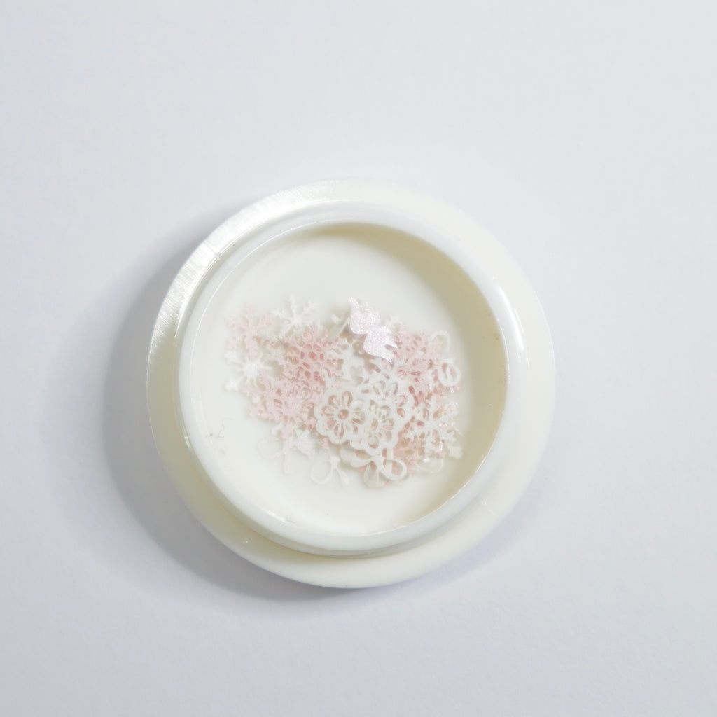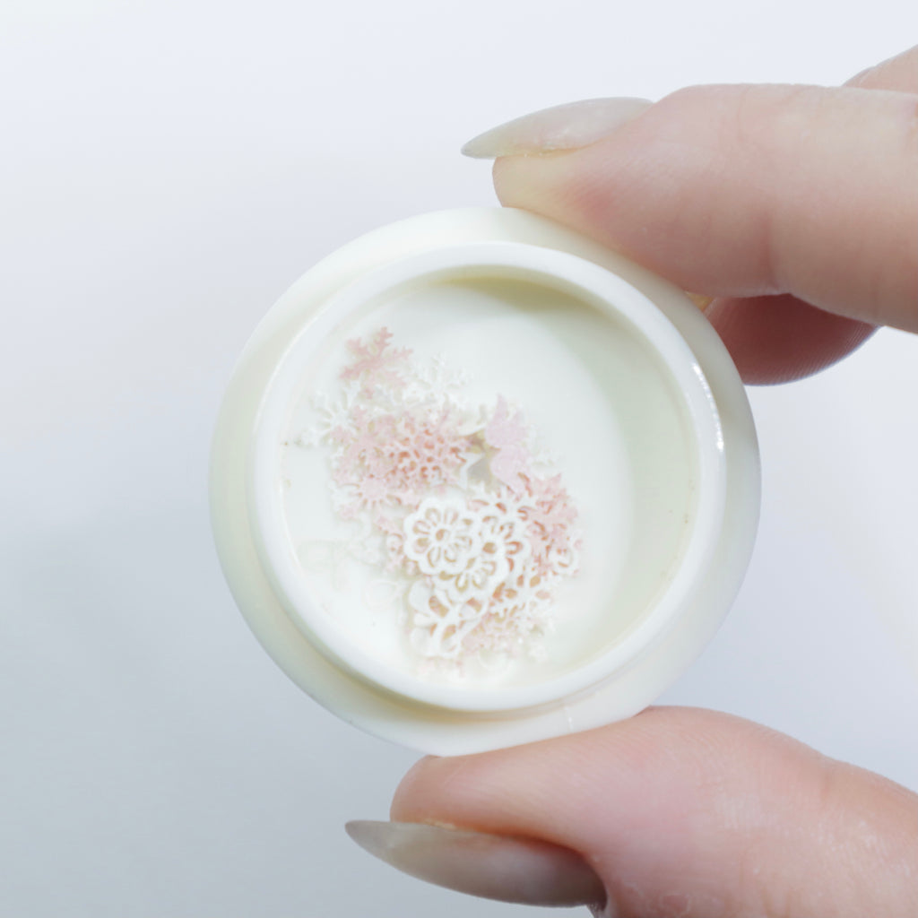 It comes in a small white pot and has a variety of designs, from snowflakes, to hearts and Angel wings.