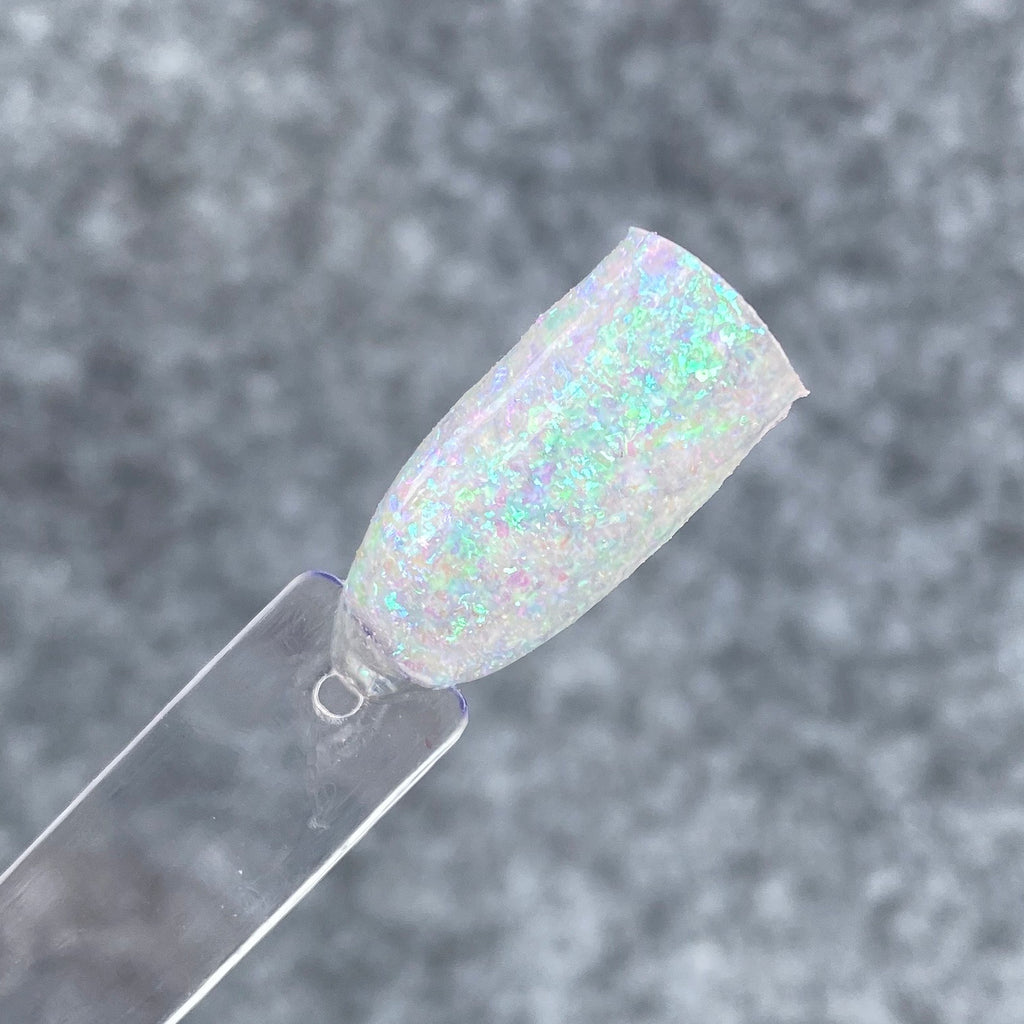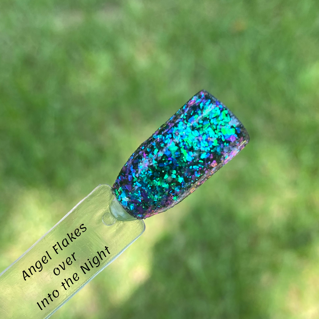 Angel Flakes is a fluffy flakey dip powder that is semi-sheer with buildable coverage. She can be worn over herself, or any color you like (pictured over black). Her colors give a chameleon effect when worn over other colors.