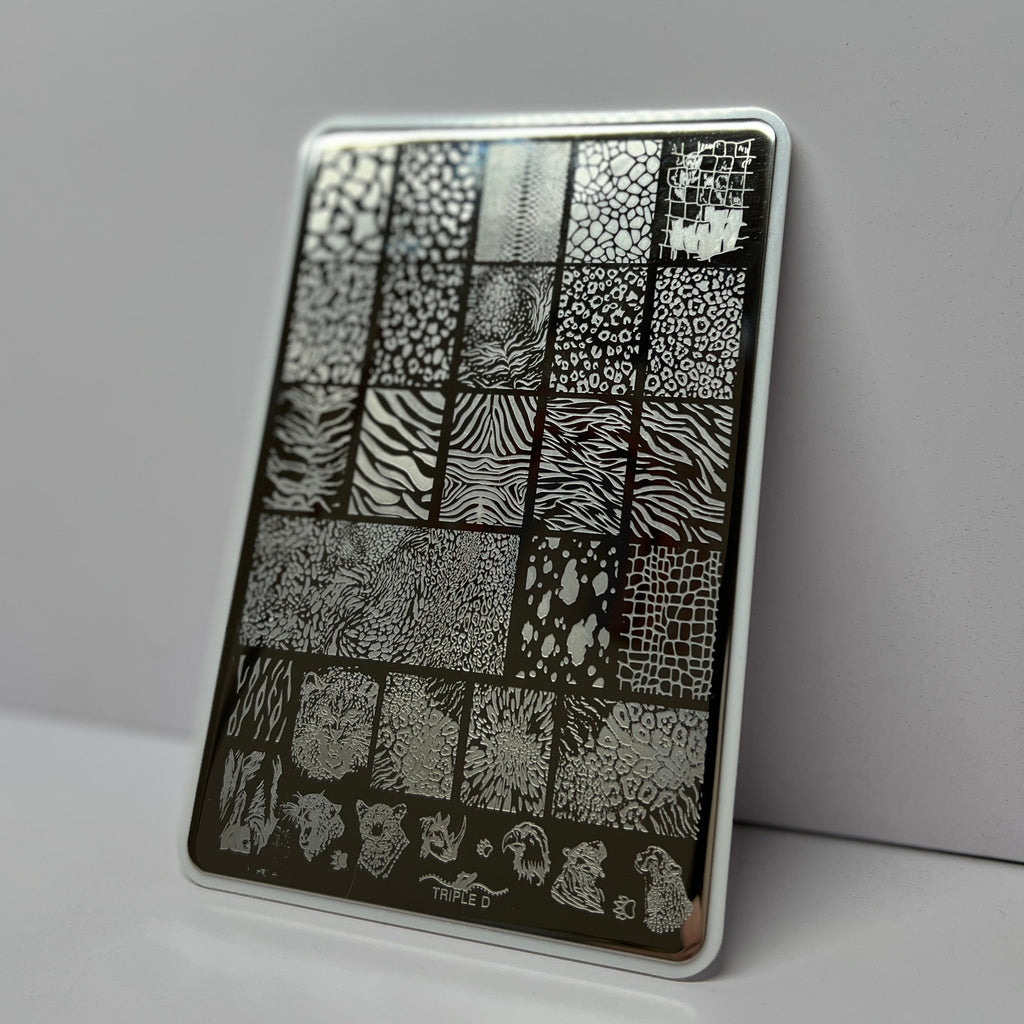 This is a listing for a large stamping plate that features a variety of animal print designs. It is used for stamping nail art designs.