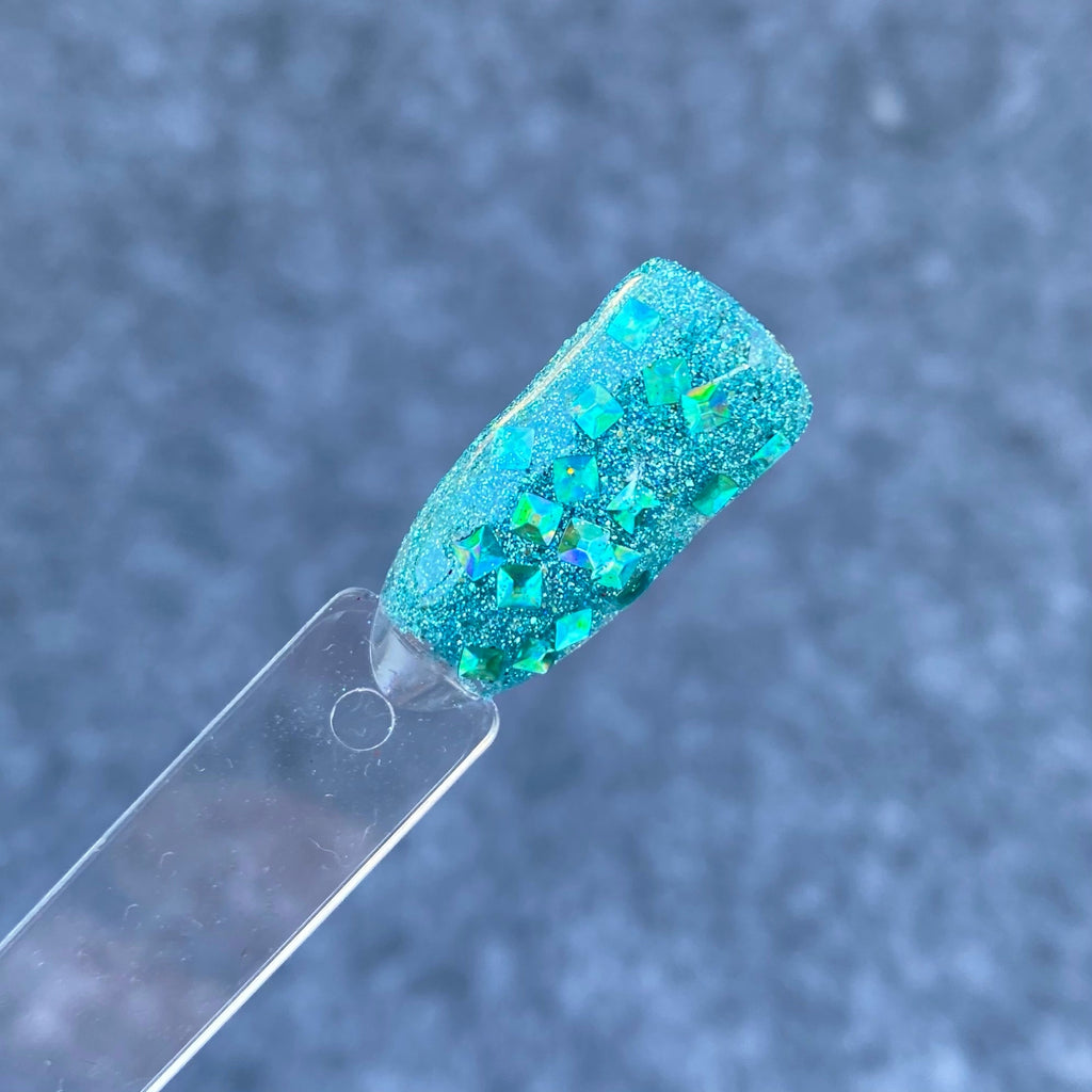 Aphrodisiac is a 3D multi shaped turquoise glitter dip powder with turquoise smaller sized glitters.