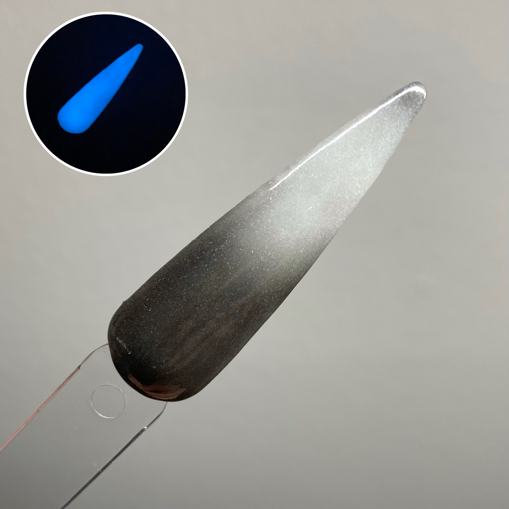 Blue Moon is a solid color changing glow powder that features a nearly charcoal black to colorless thermal change and glows blue. Darker colors need longer UV exposure to be able to glow.