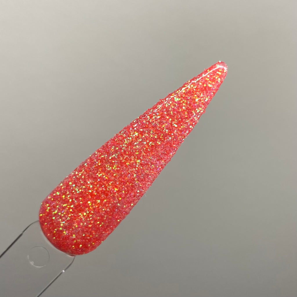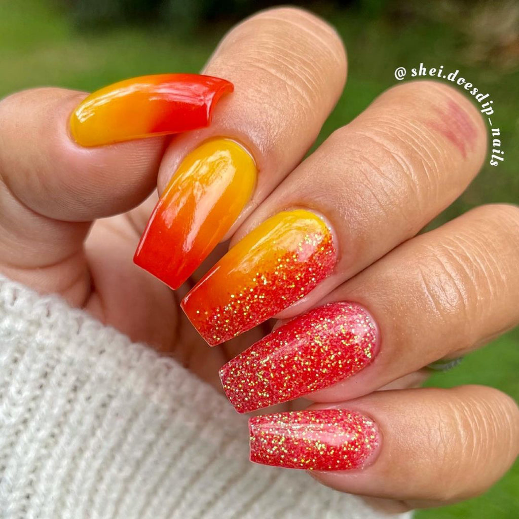 Bonfire Bliss is a semi-translucent red/orange glitter dip powder with a green/yellow shift that gives in that fiery look.