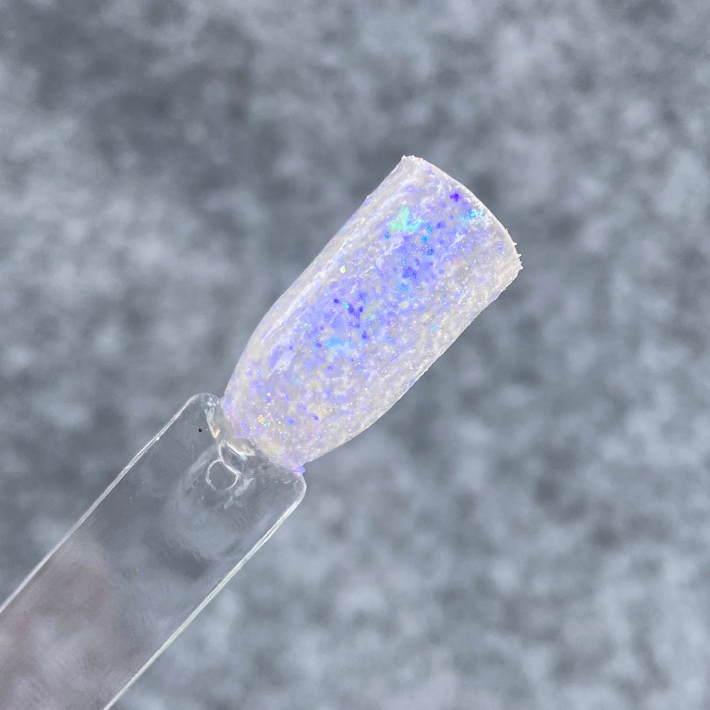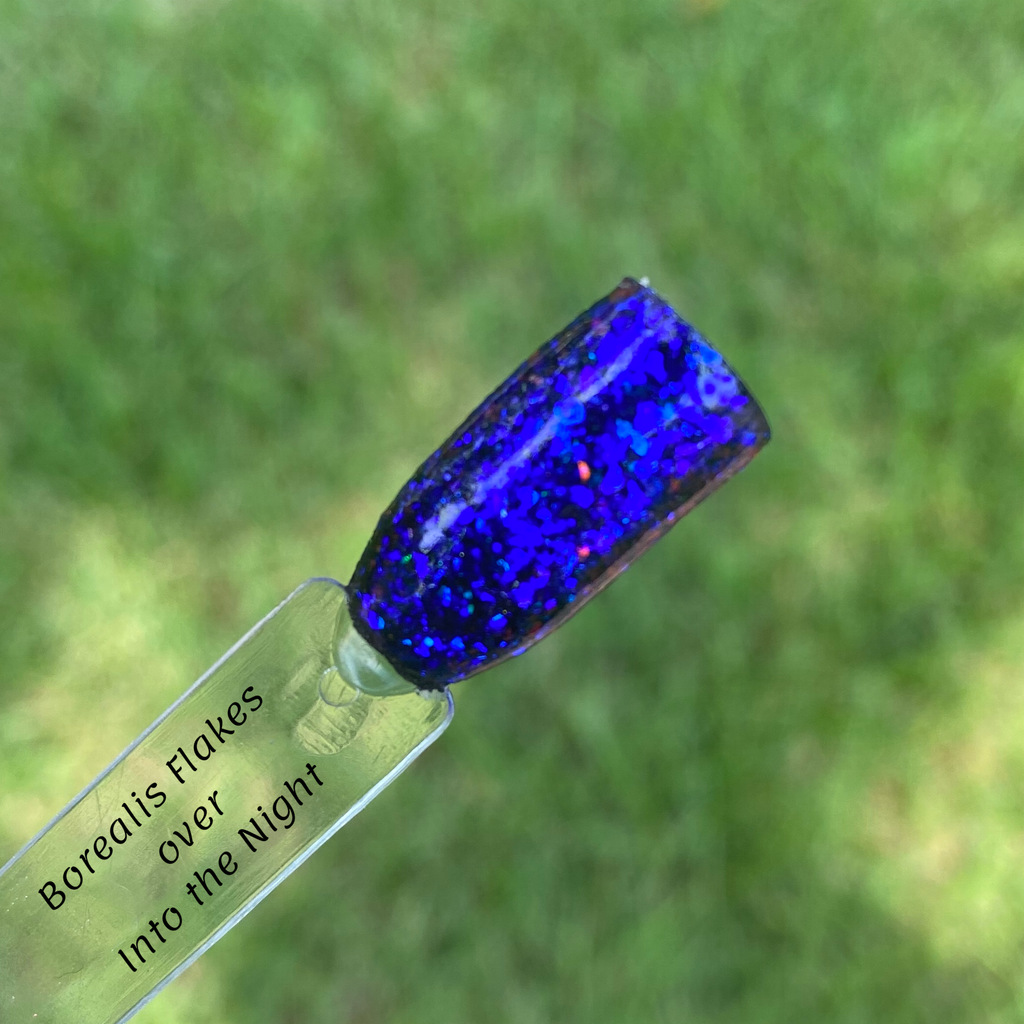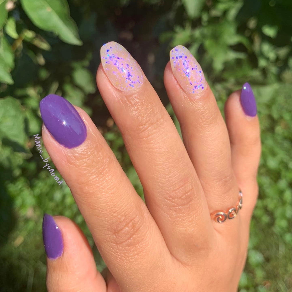 Borealis Flake is a sheer flake dip powder, which can be worn over any color. When worn alone, it gives off a blurple color shift, and when worn over other colors, it enhances that shift.