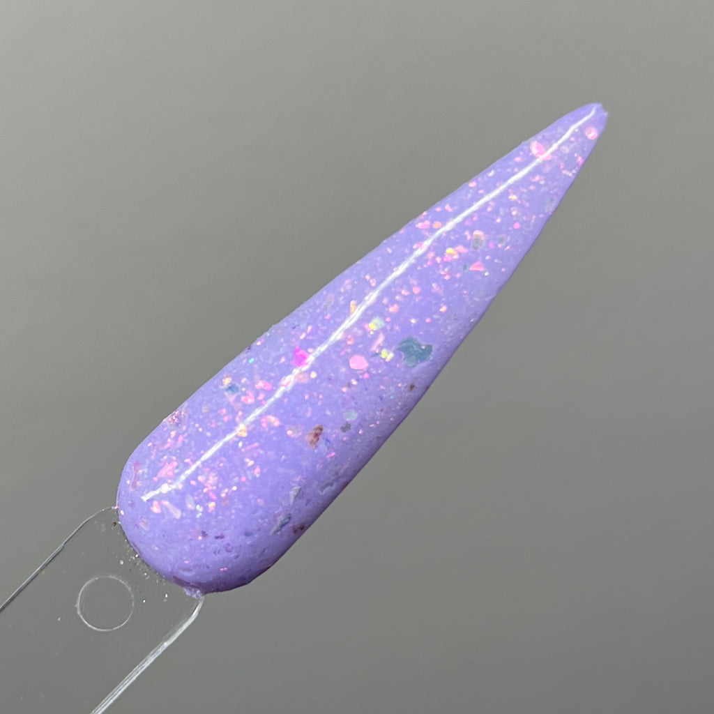 Butterfly Angel is a purple base dip powder with medium shifting flake pieces that can appear silver and pink.