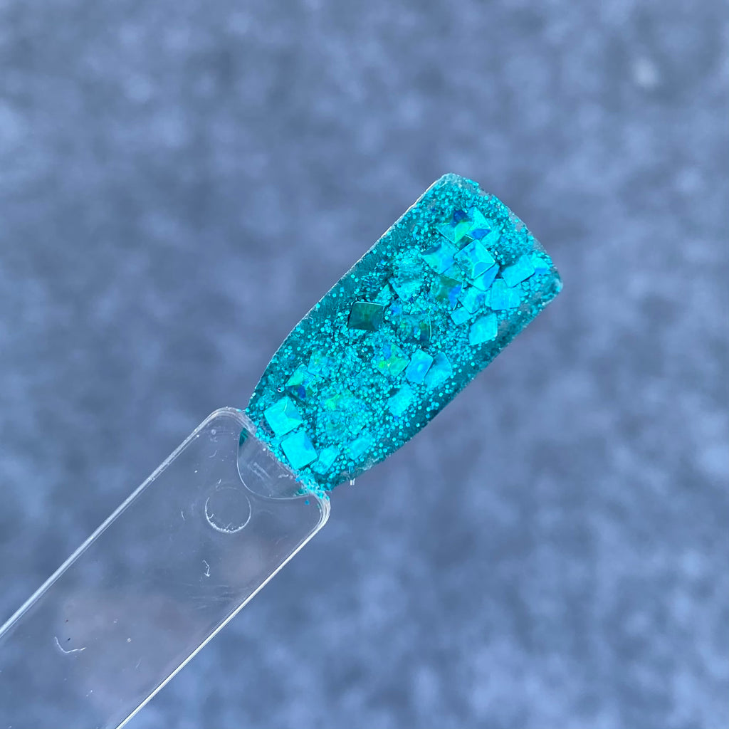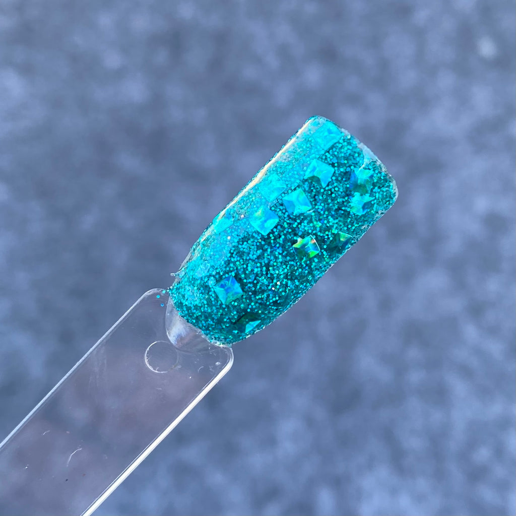 Catch Me Outside is a 3D multi shaped glitter dip powder with teal blue smaller sized glitters.