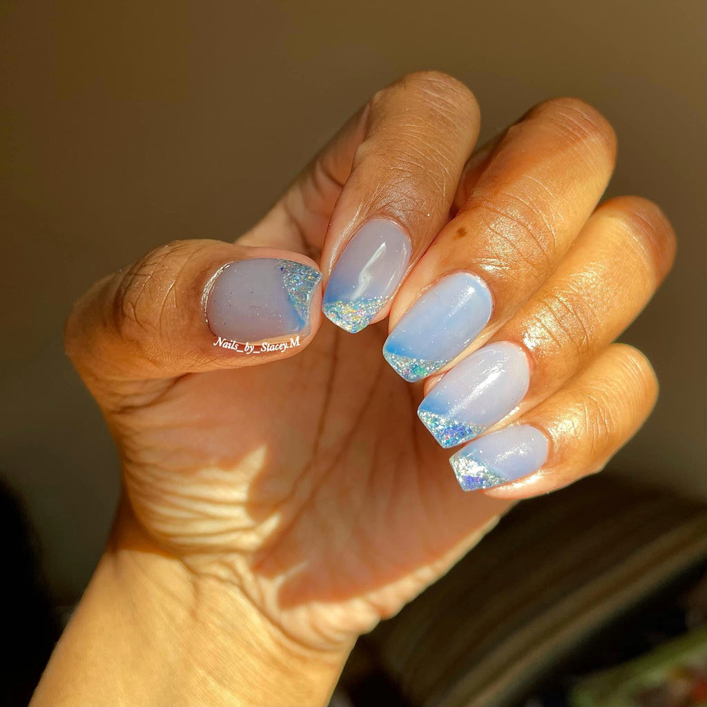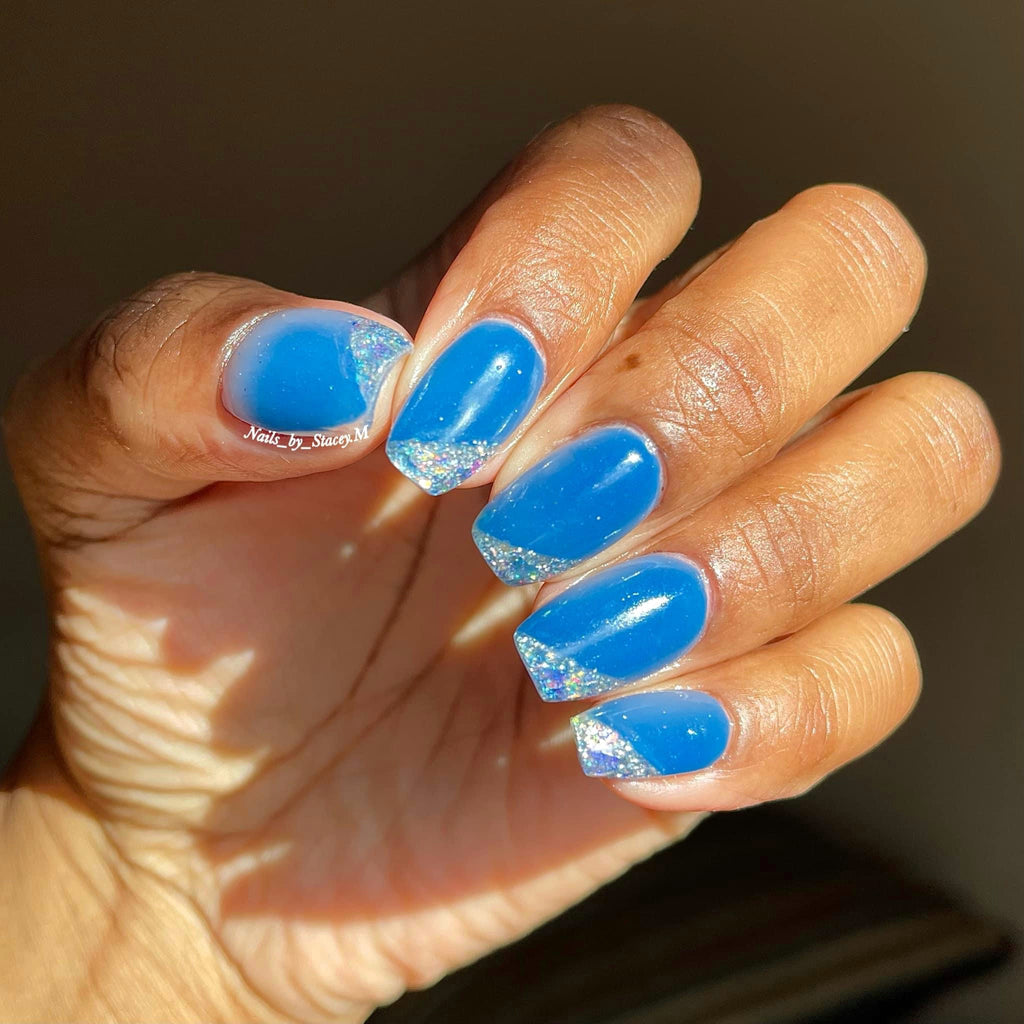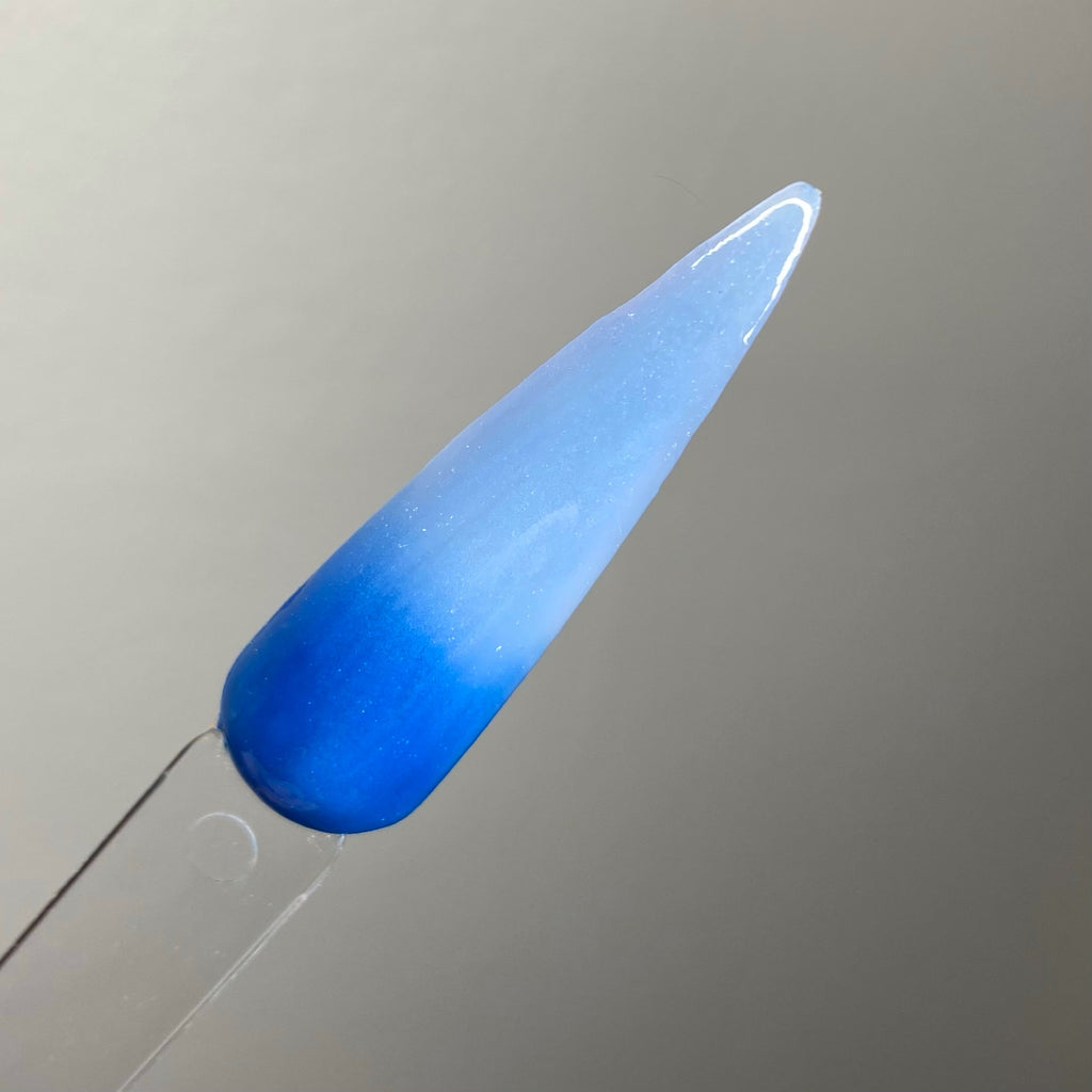 Exposed is a thermal powder that changes from a medium blue to a light blue.