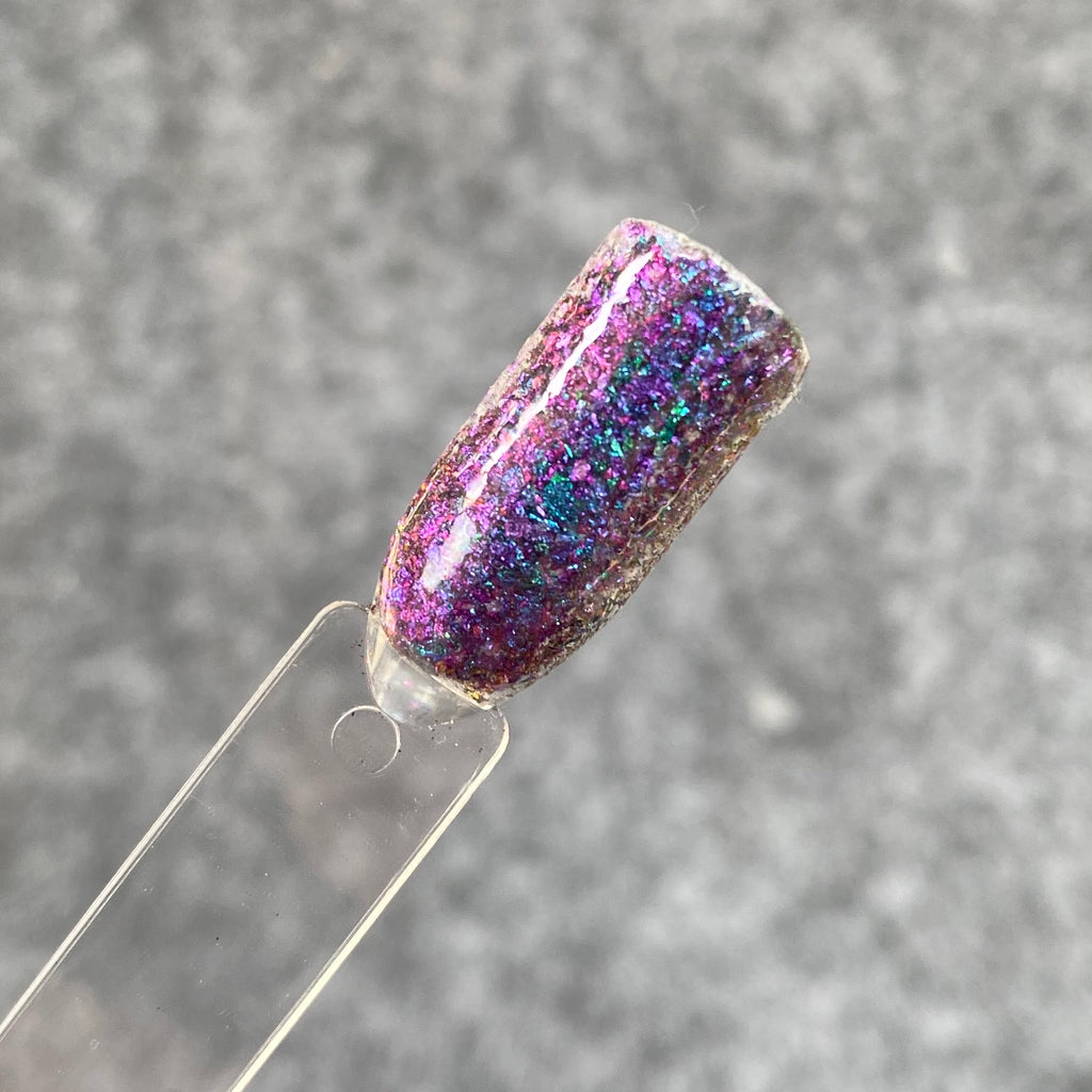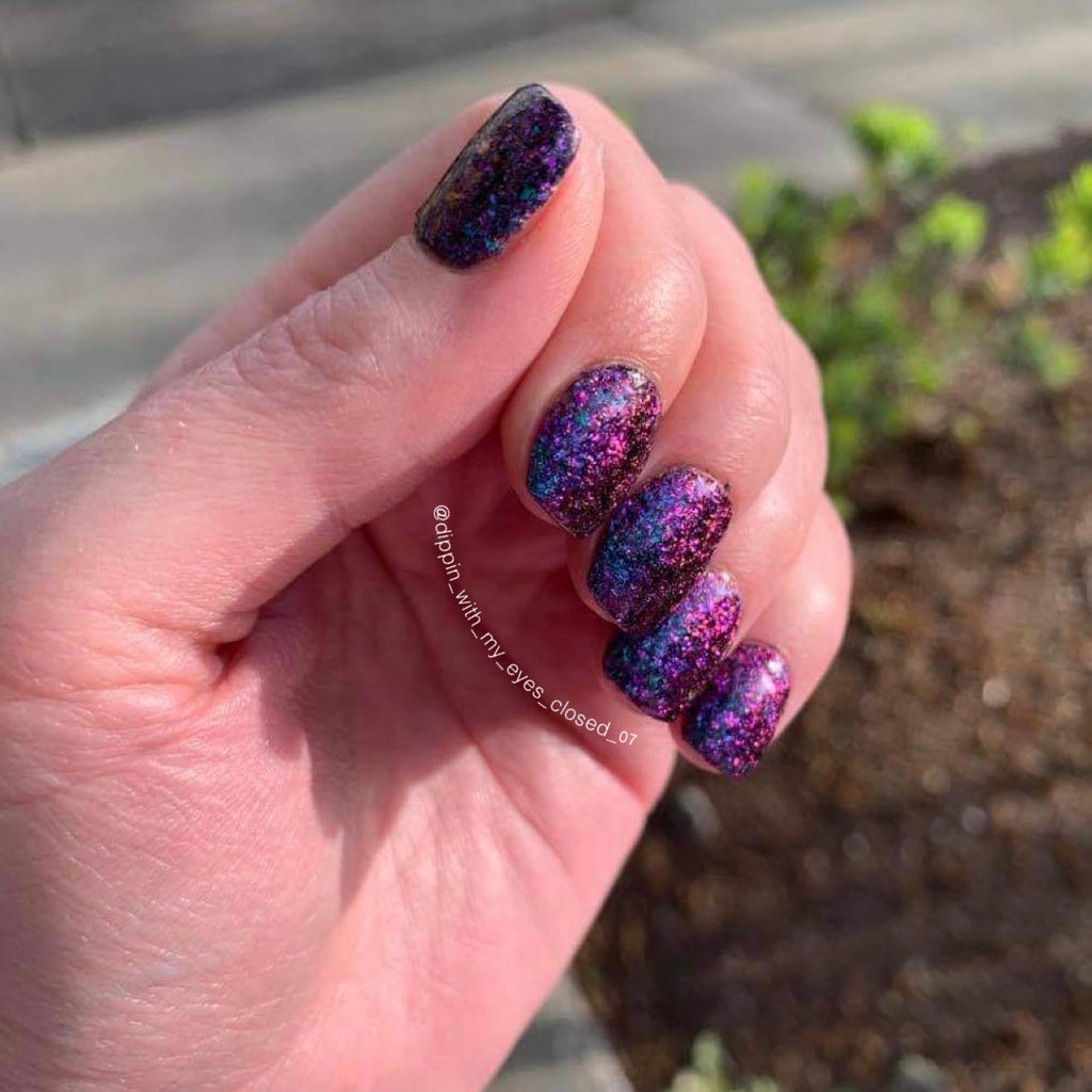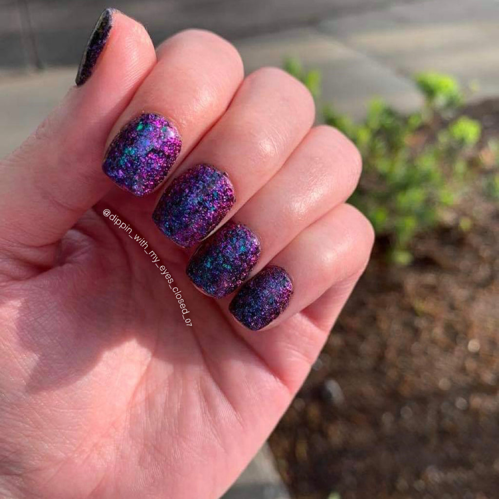 Flakers Are Gonna Flake is a dip powder consisting  of shifting flakes that shift from purple to blue to turquoise and pink.