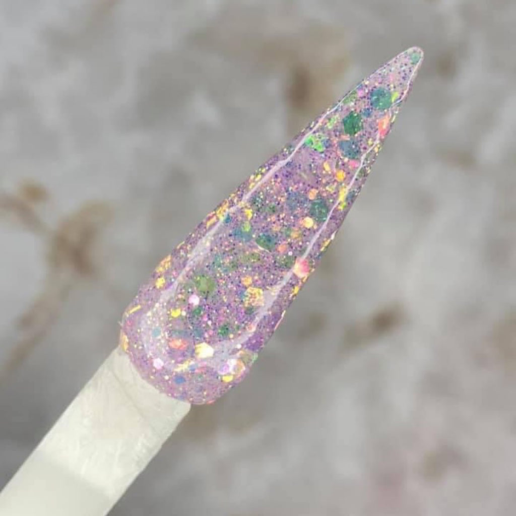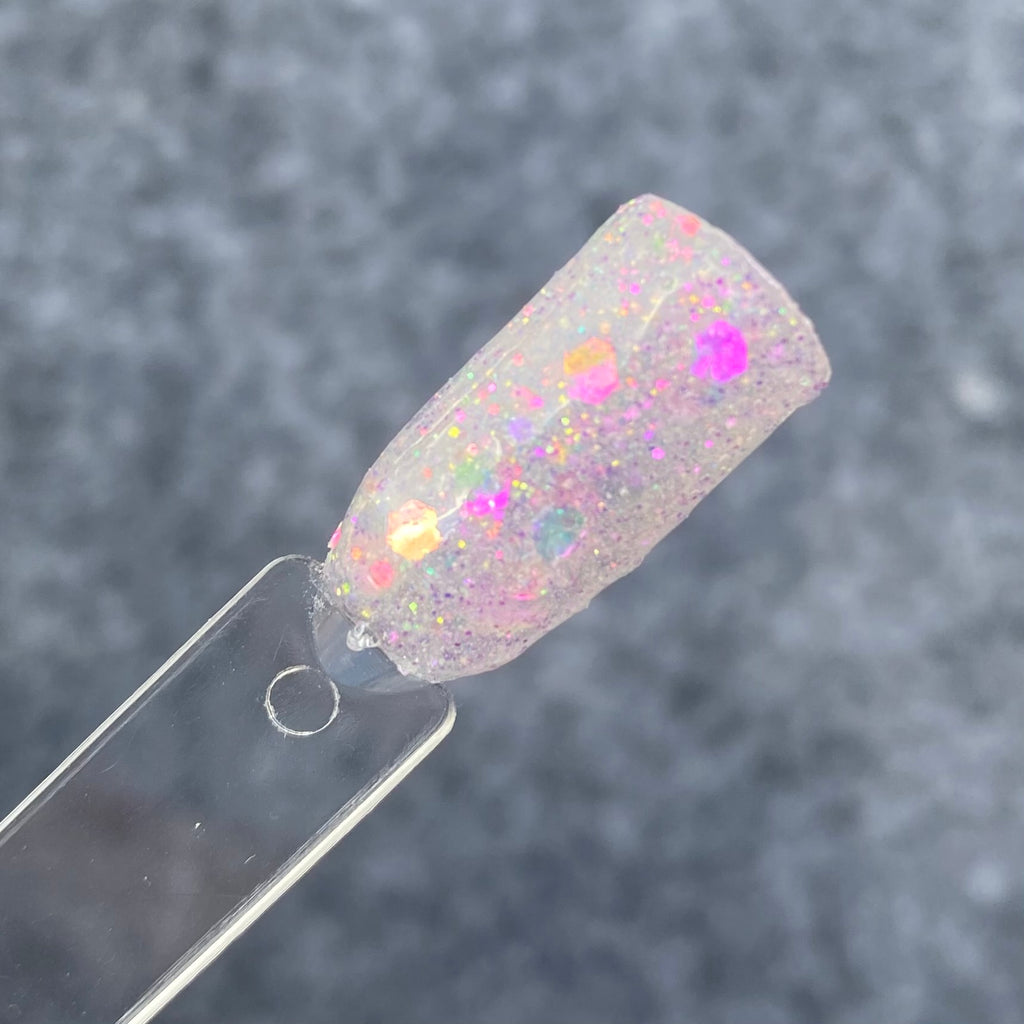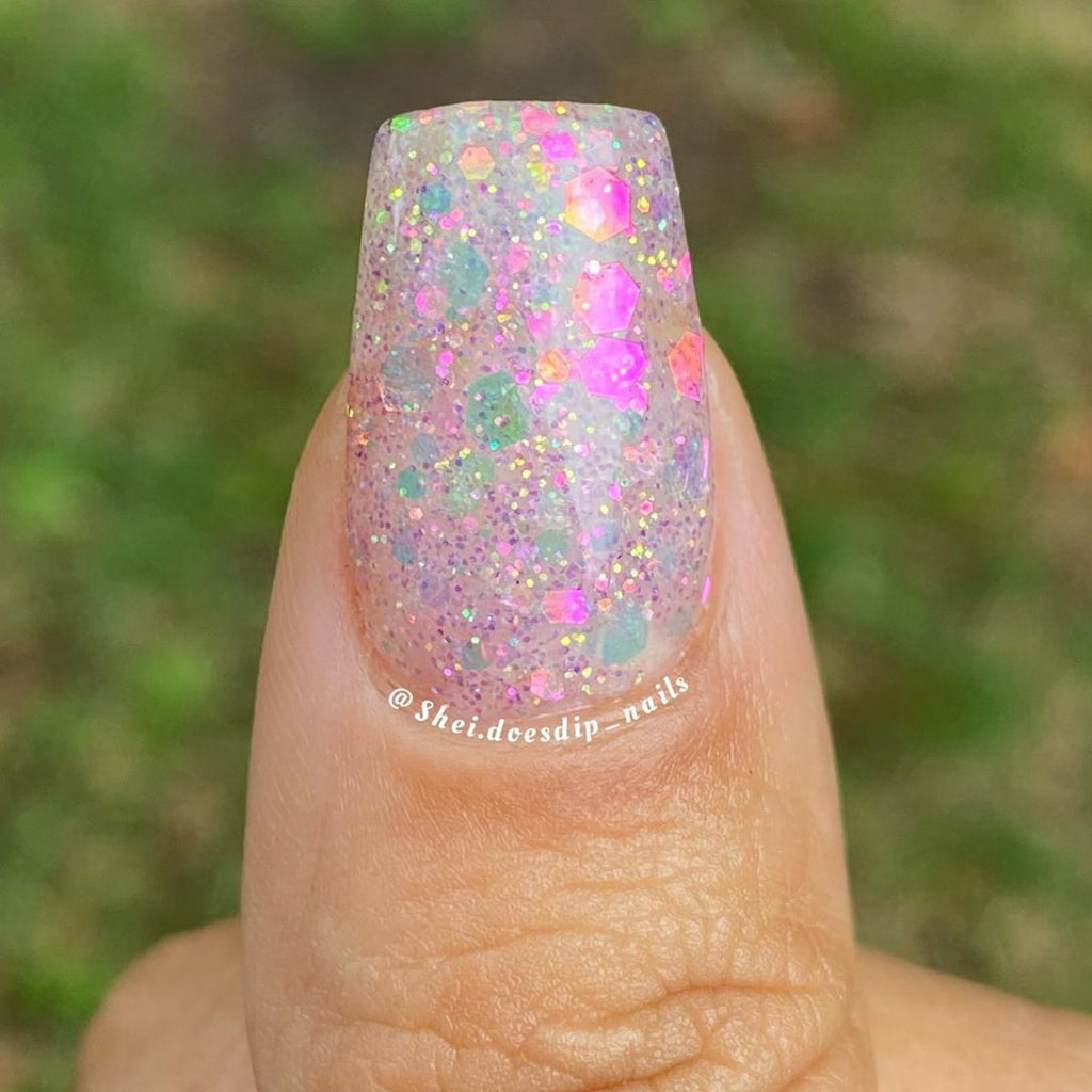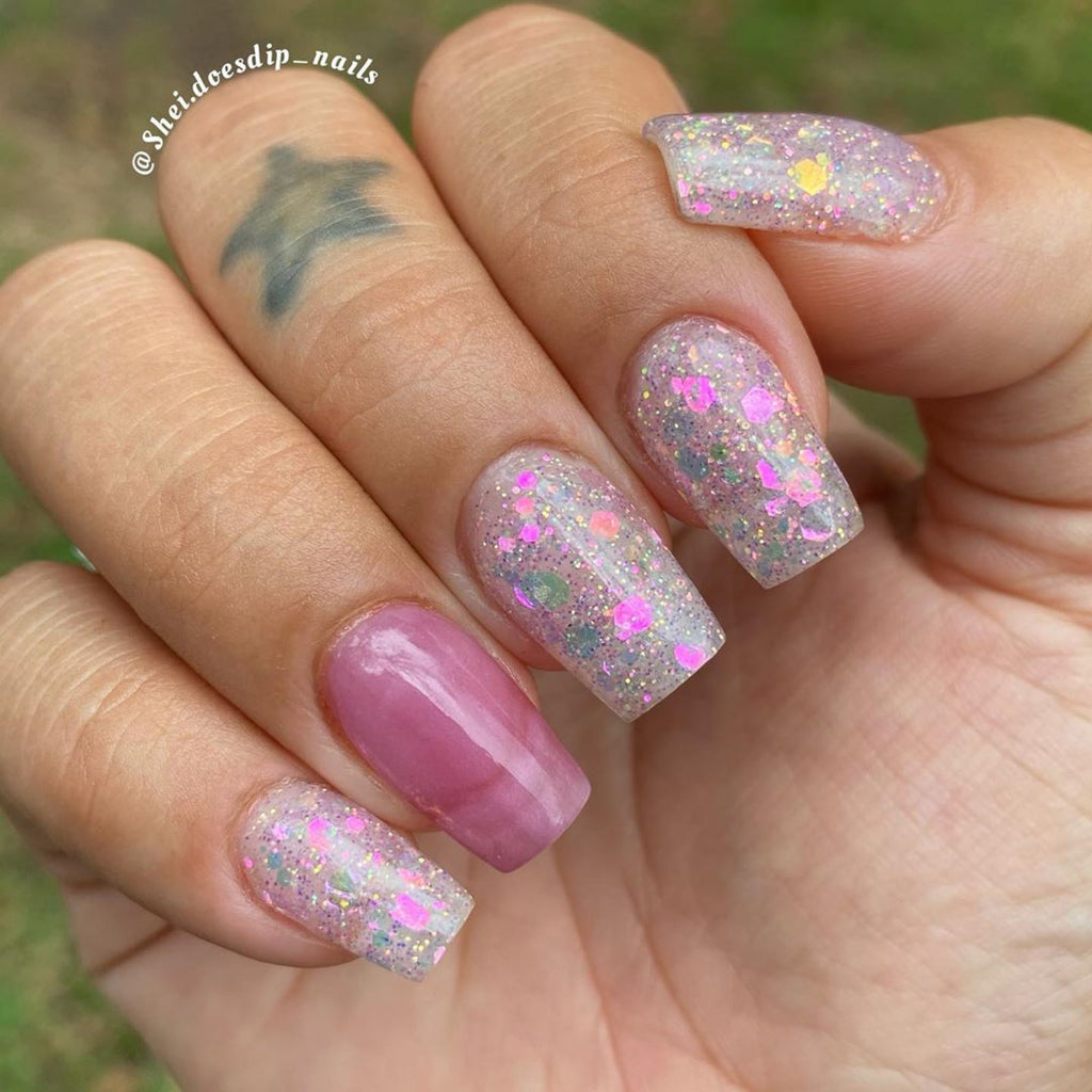Fushia Phlox is a multi sized glitter with fine and chunky sizes, featuring a semi-translucent base, and chunky glitters that shift from pink to fushia.