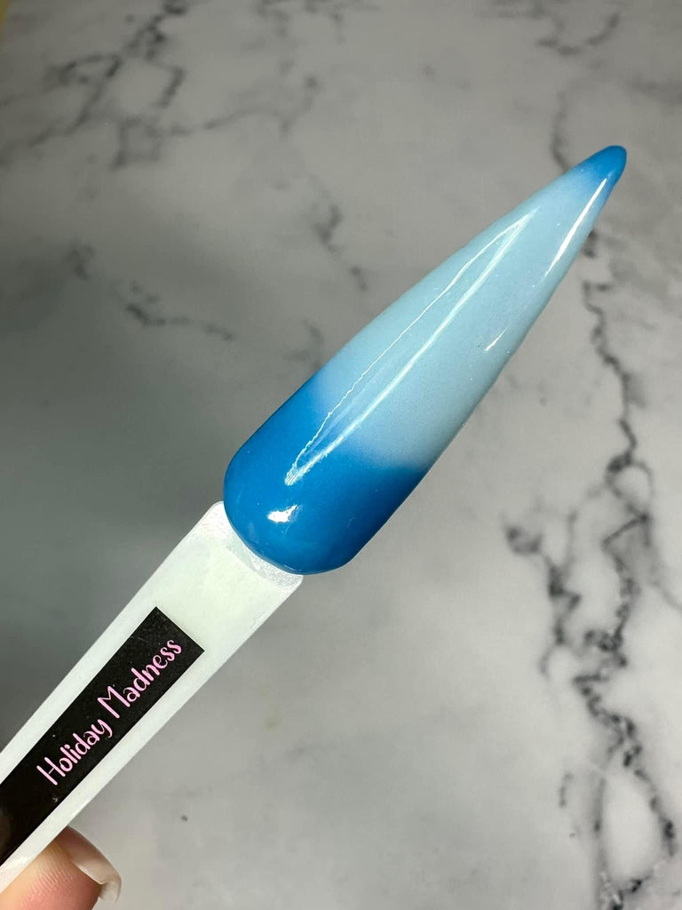 Holiday Madness is a thermal and glow powder that changes from a blue to a light milky blue and also glows blue.