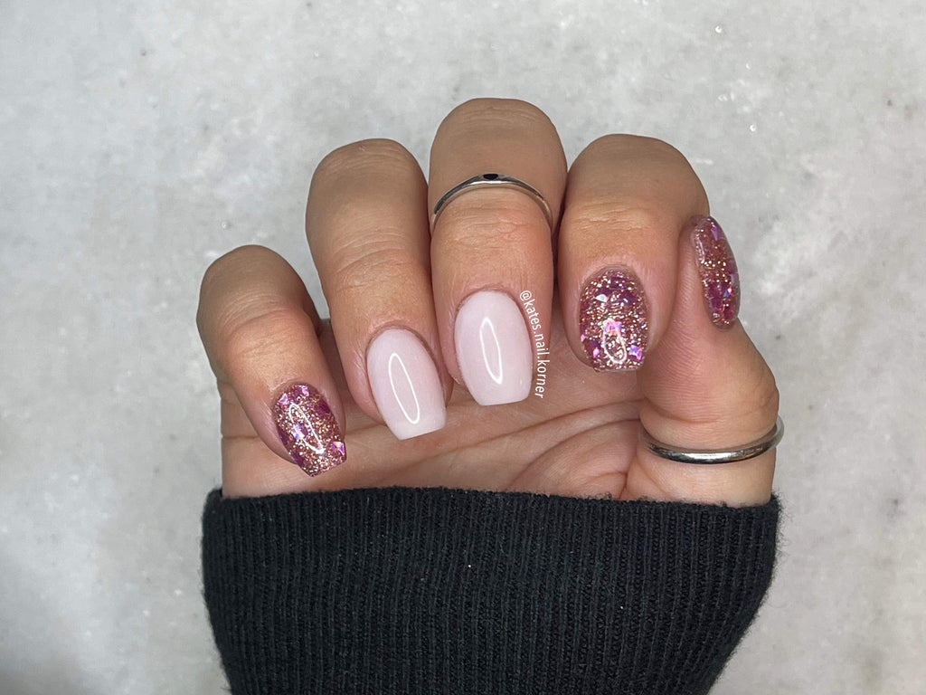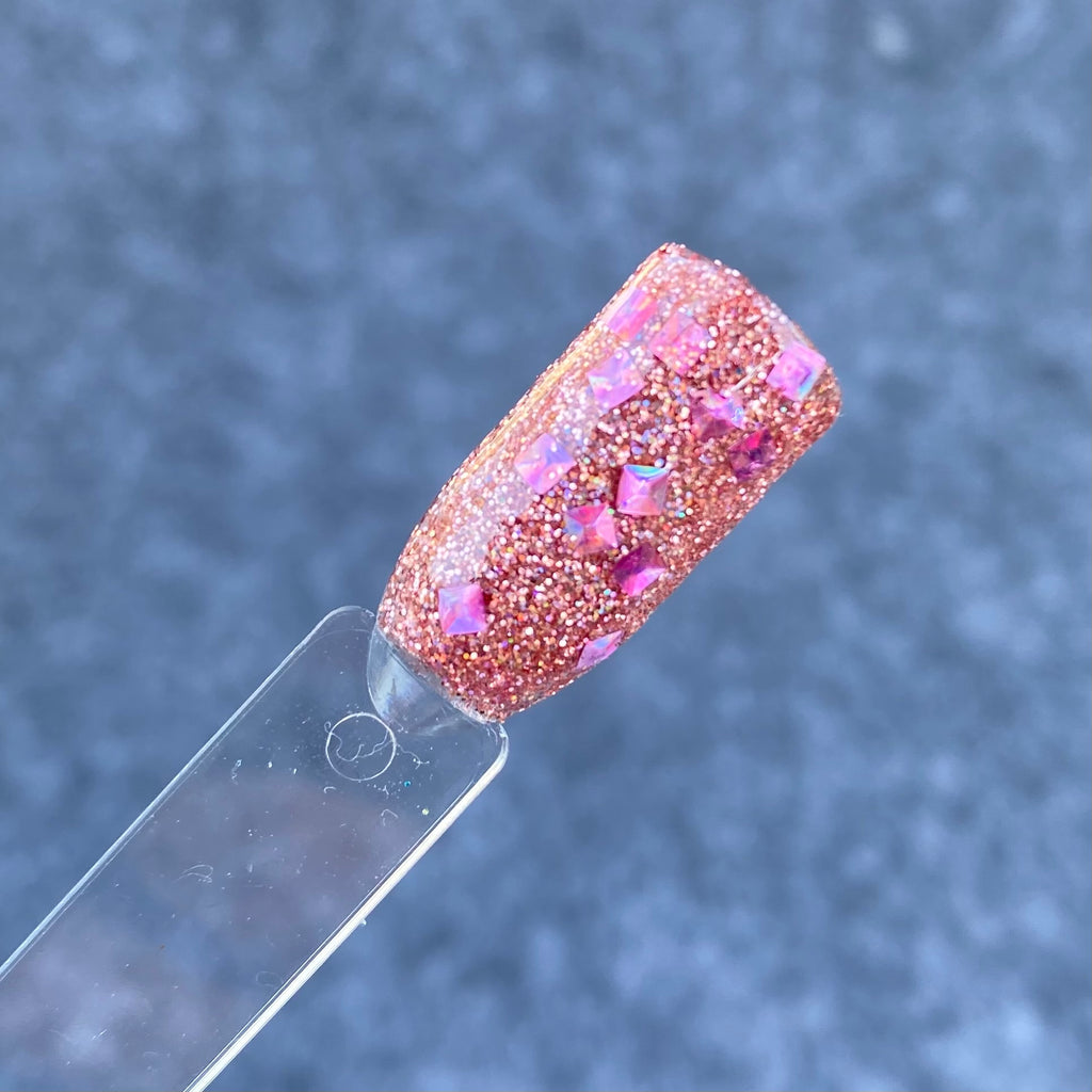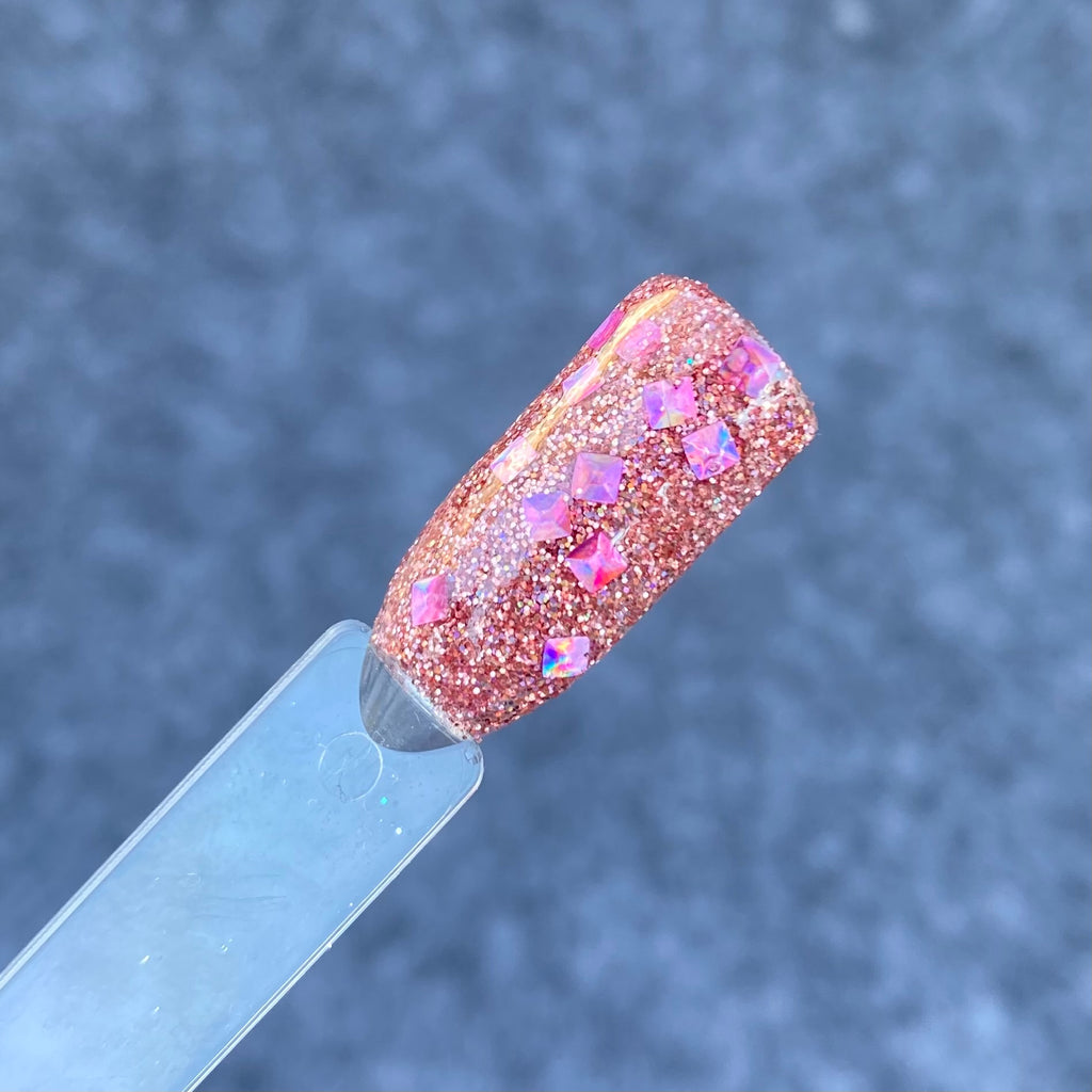 Hot Damn is a 3D multi shaped pink glitter dip powder with holographic rose gold  smaller sized glitters.