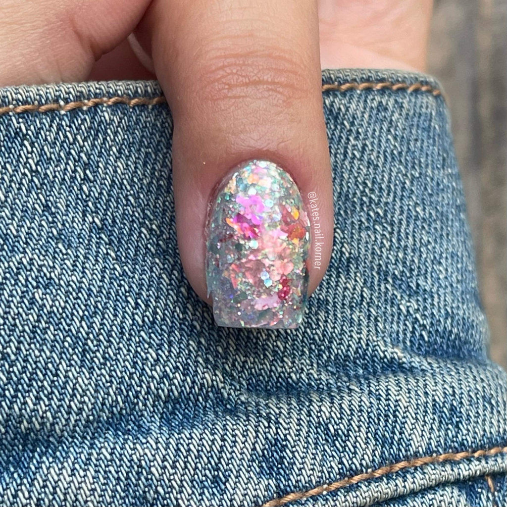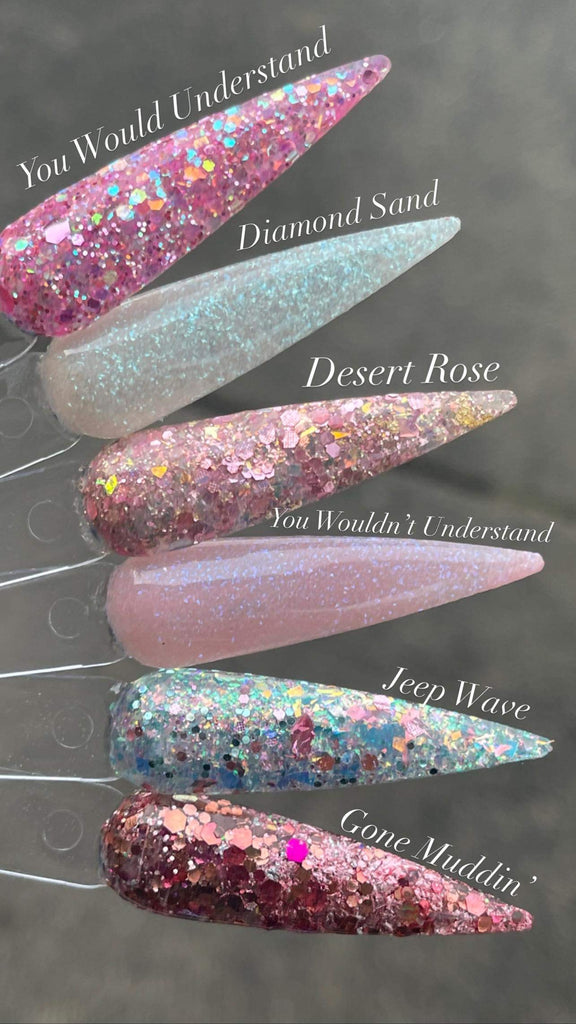 Jeep Wave is a fun iridescent and blue glitter mixture with textured rose gold glitter pieces.