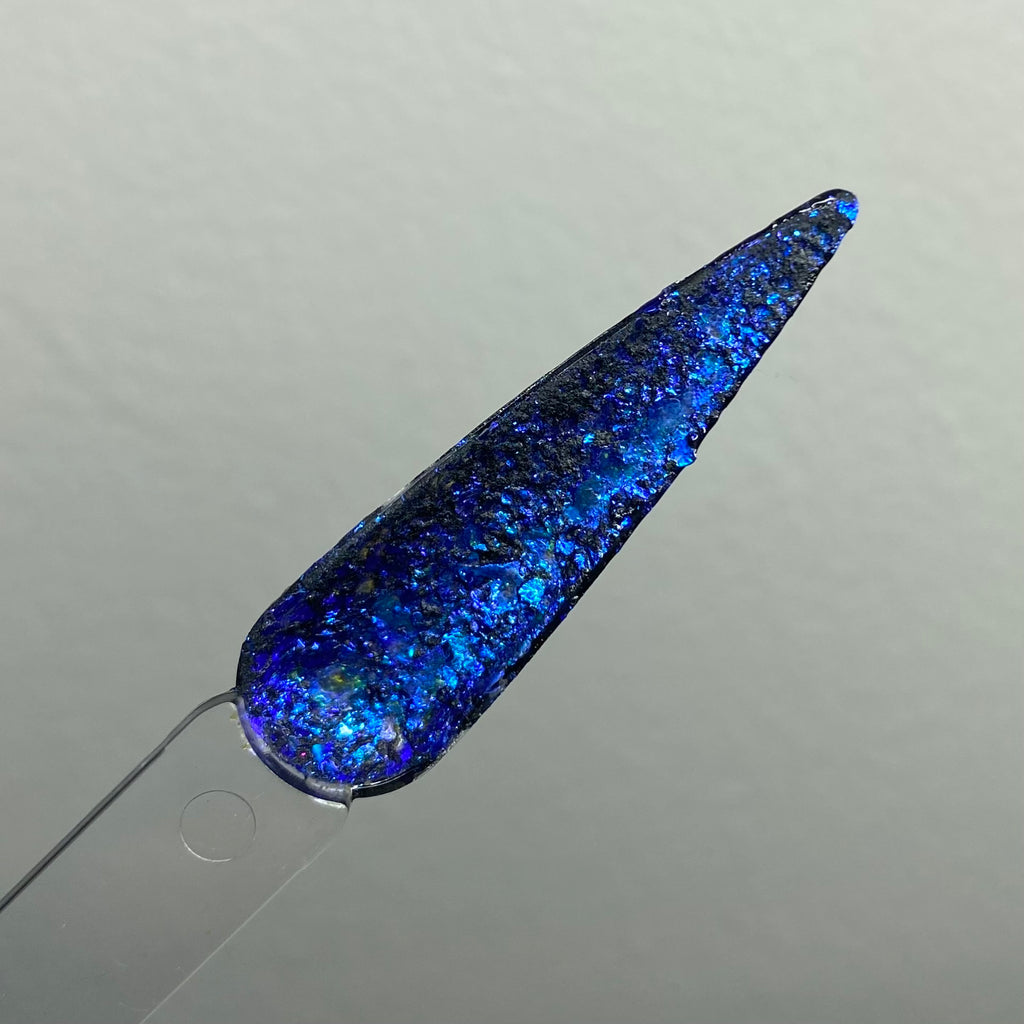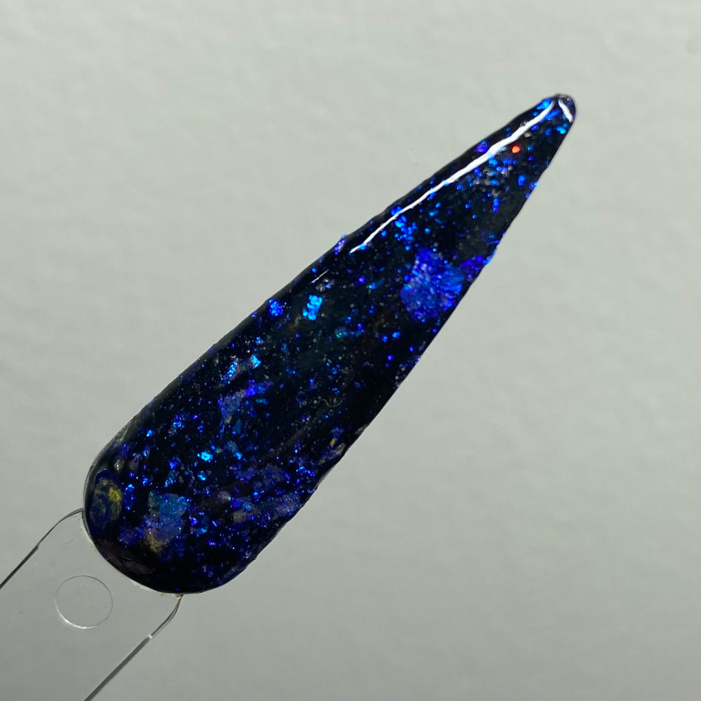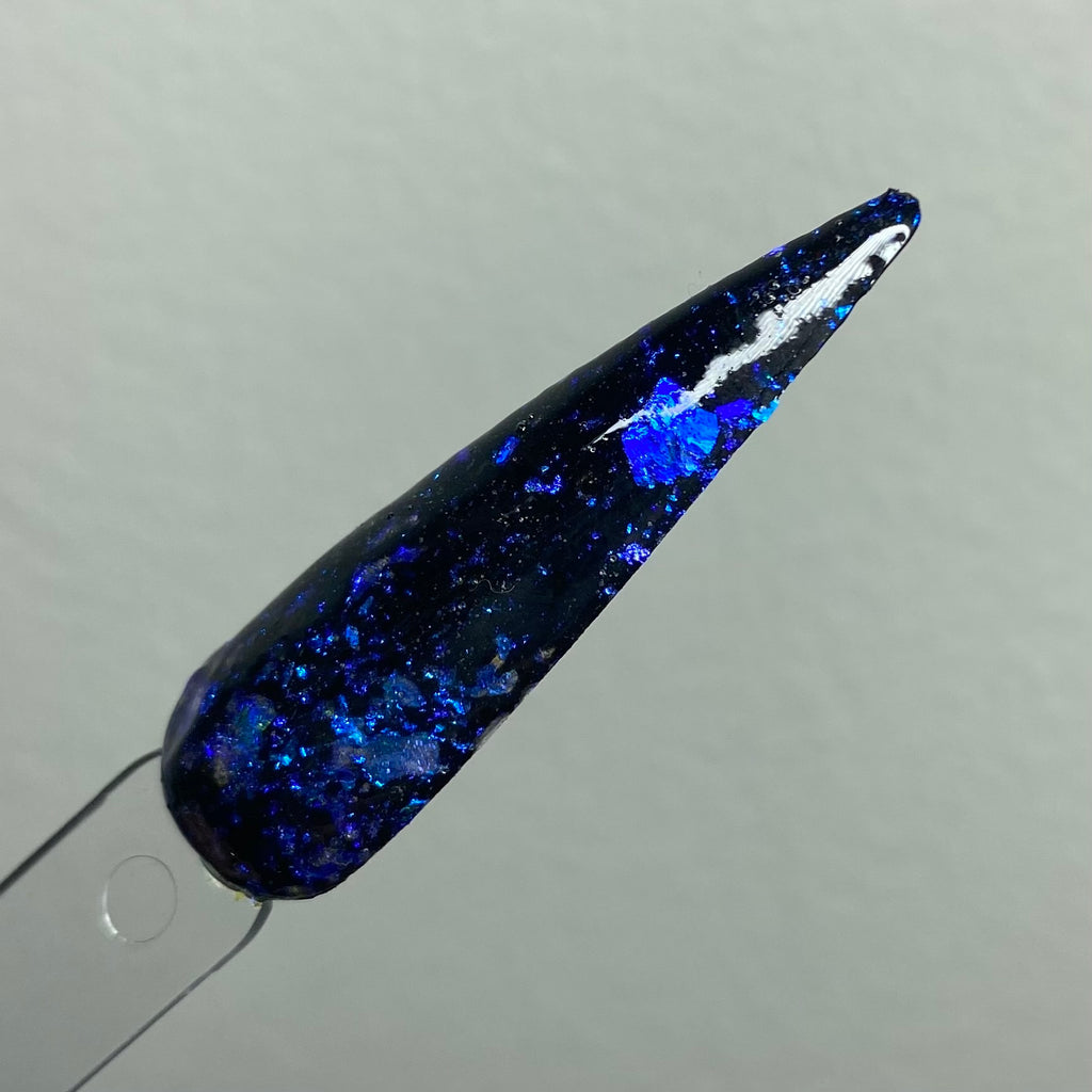 Jewlz Soul is a flake dip powder with a black base and blue opalescent flakes
