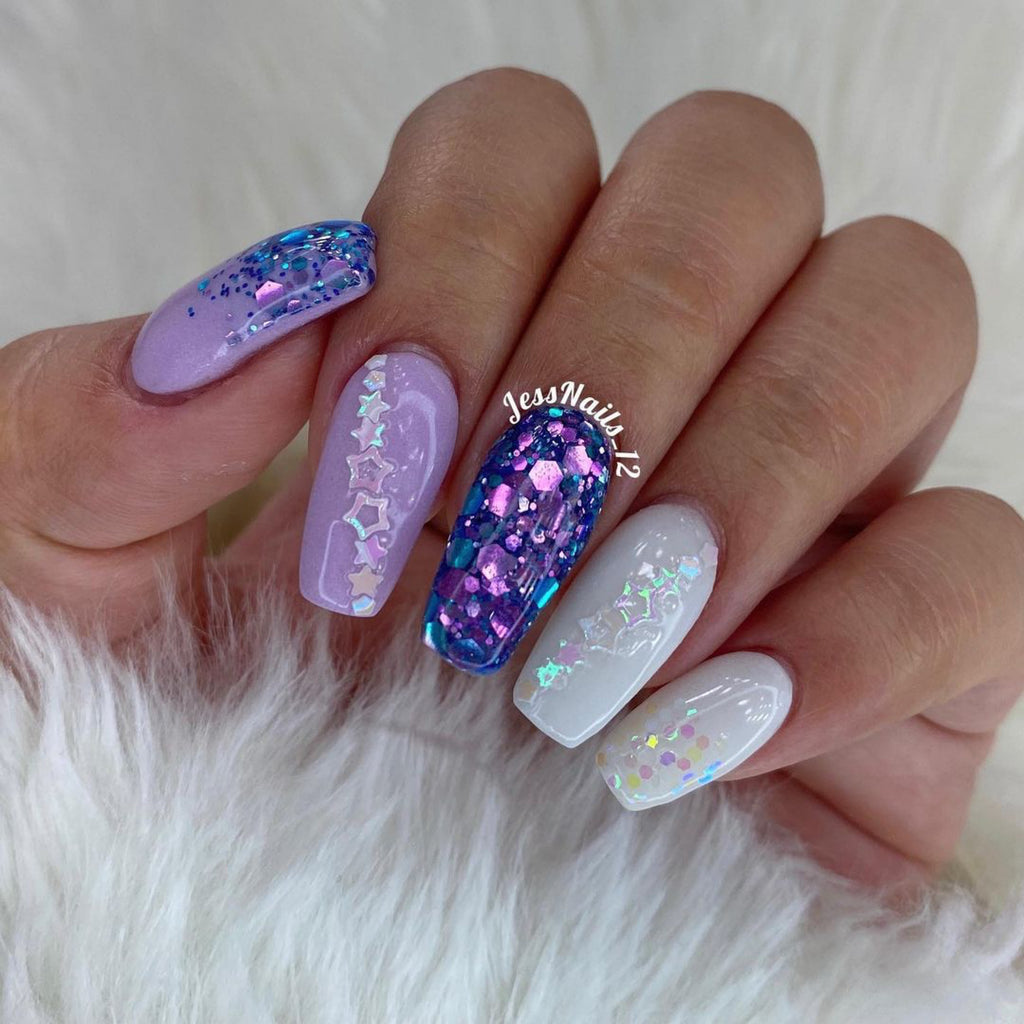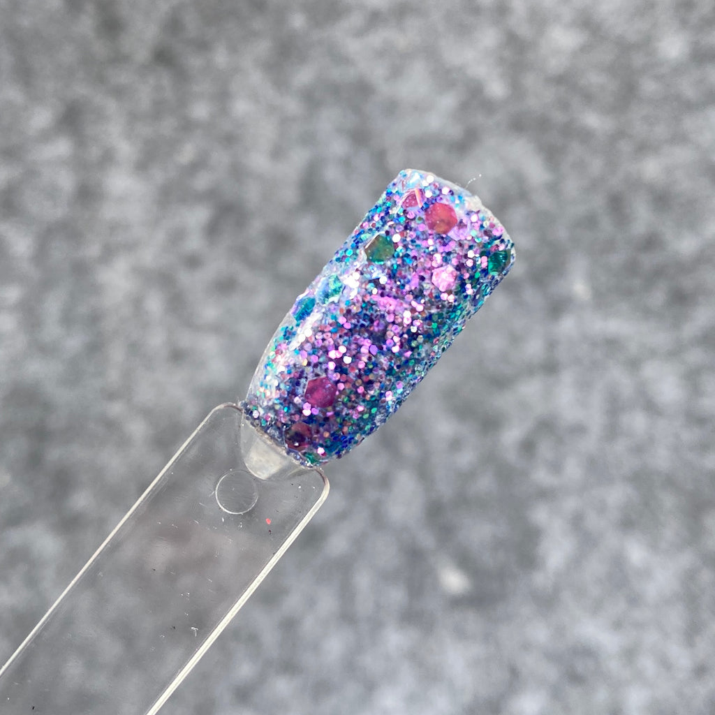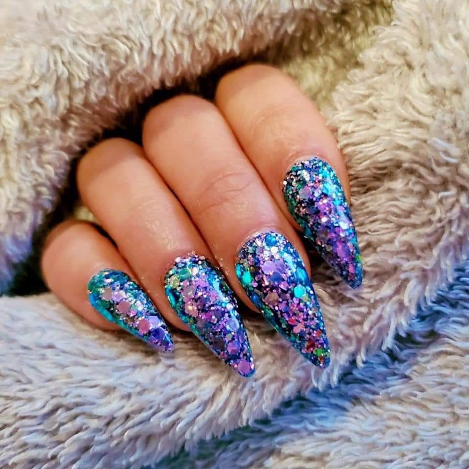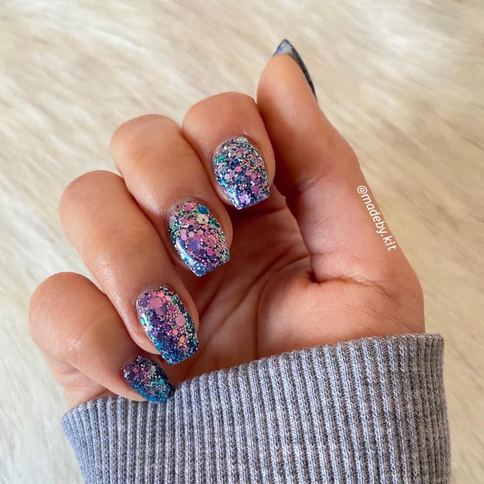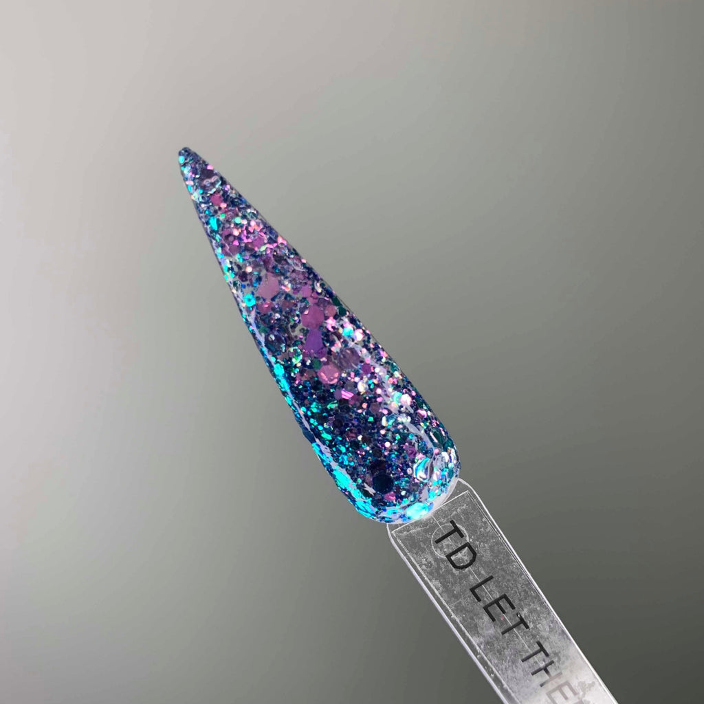 Let Them Eat Cake is a chunky mix of shifting glitters that shift from purple to blue.