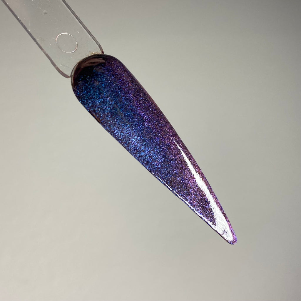 Obsidian is a 2-in-1 dip powder that can be chromed or used as a dip powder. It shifts from blue to purple, depending on how the light hits the color.