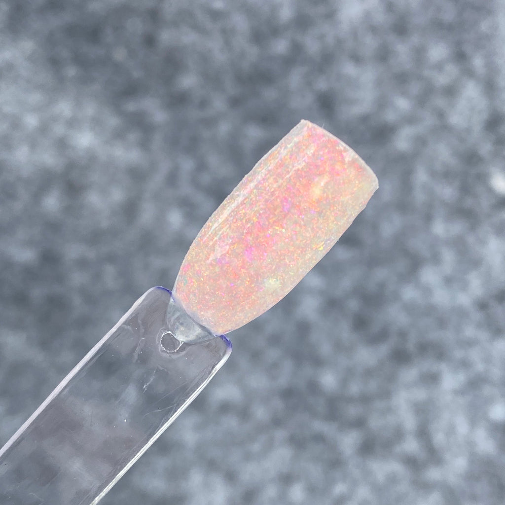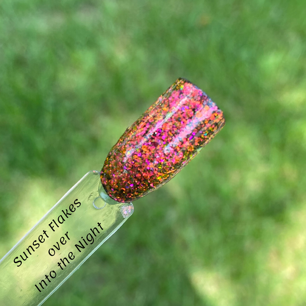 Sunset Flakes is a flake dip powder, which has a translucent base, and orange and pink flakes that will shift with the light.