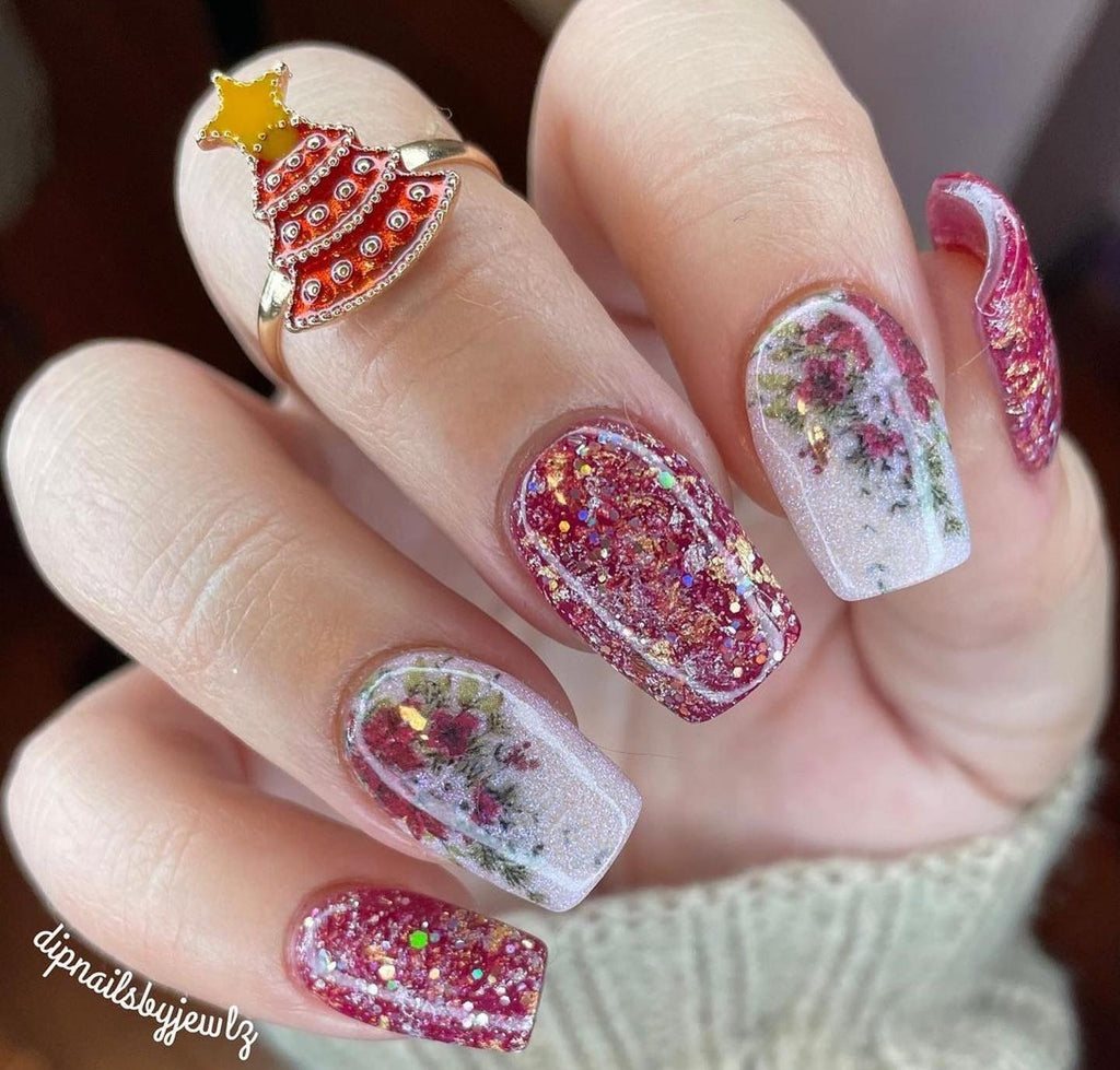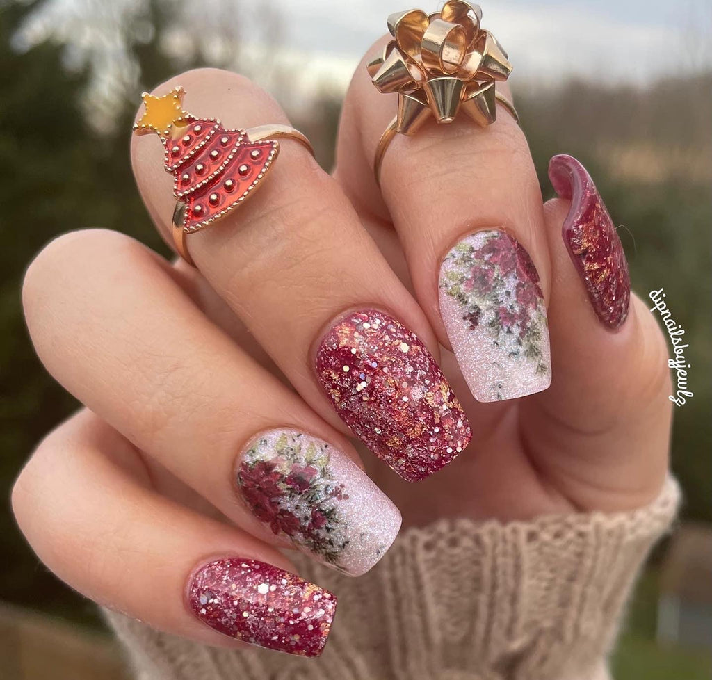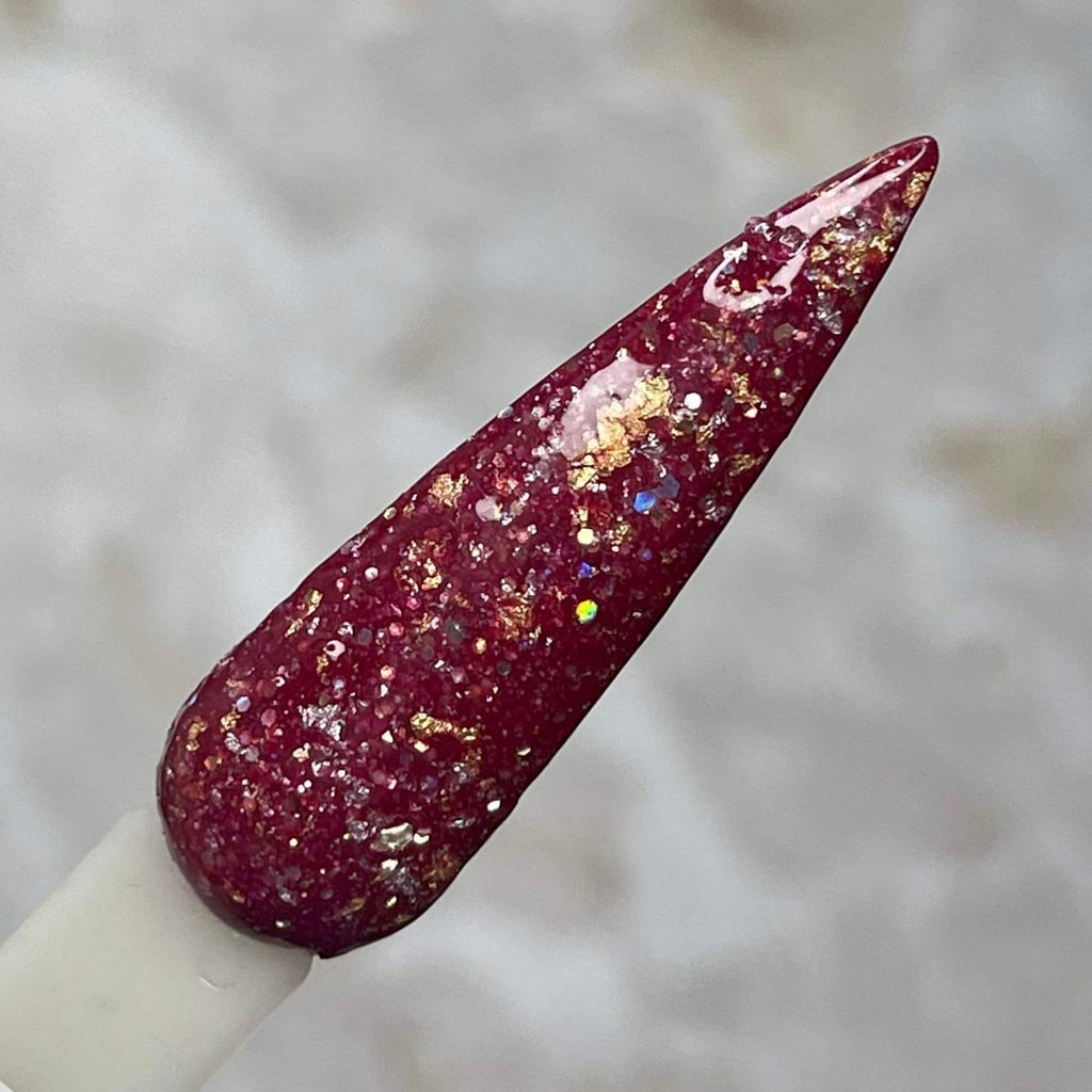 'Tis the Season is a deep berry shimmer dip powder with foils and glitters.