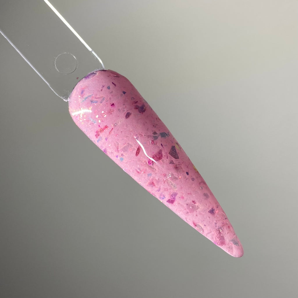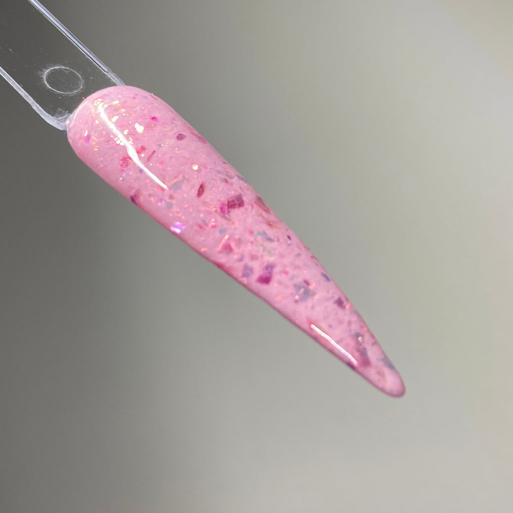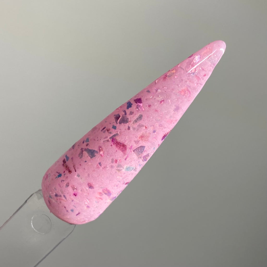 Two Angels is a perfect pink base dip powder with medium shifting flake pieces that can appear silver, light and dark pink.
