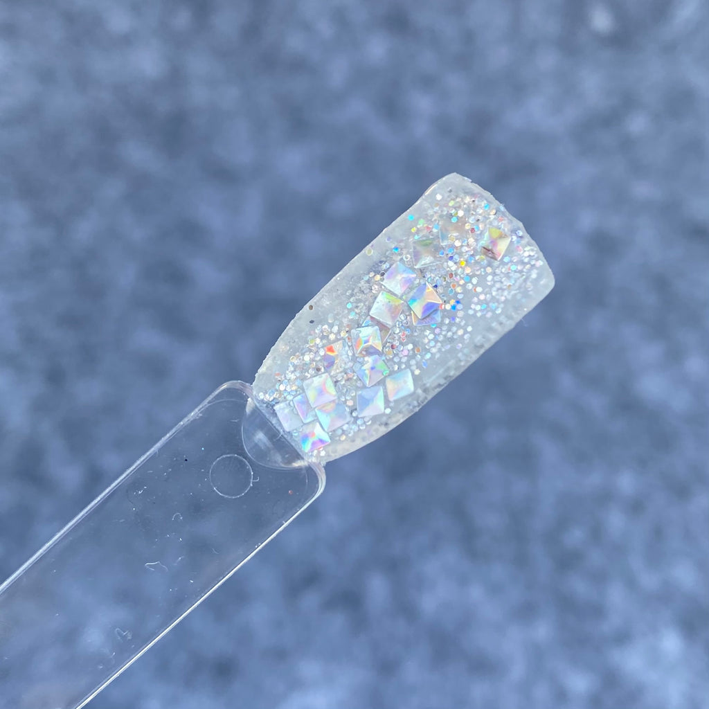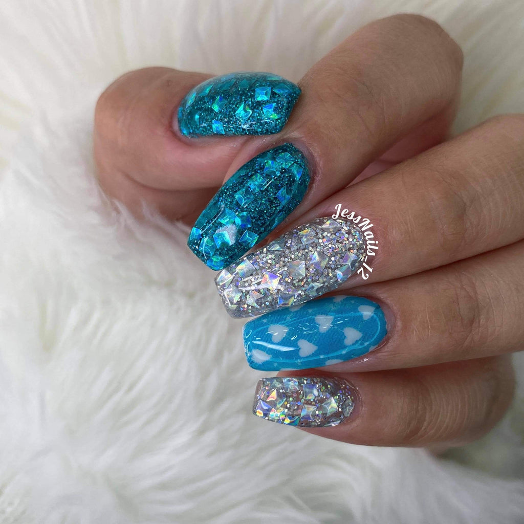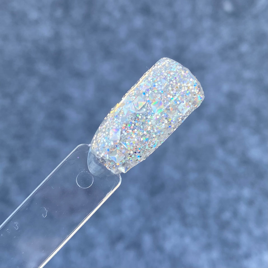 Vixen is a 3D multi shaped silver glitter dip powder with silver smaller glitters.