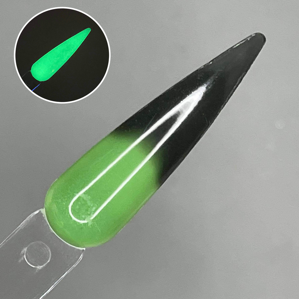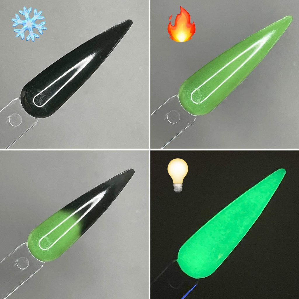 Wicked is a thermal and glow powder that changes from a a dark green to a light green and also glows green.
