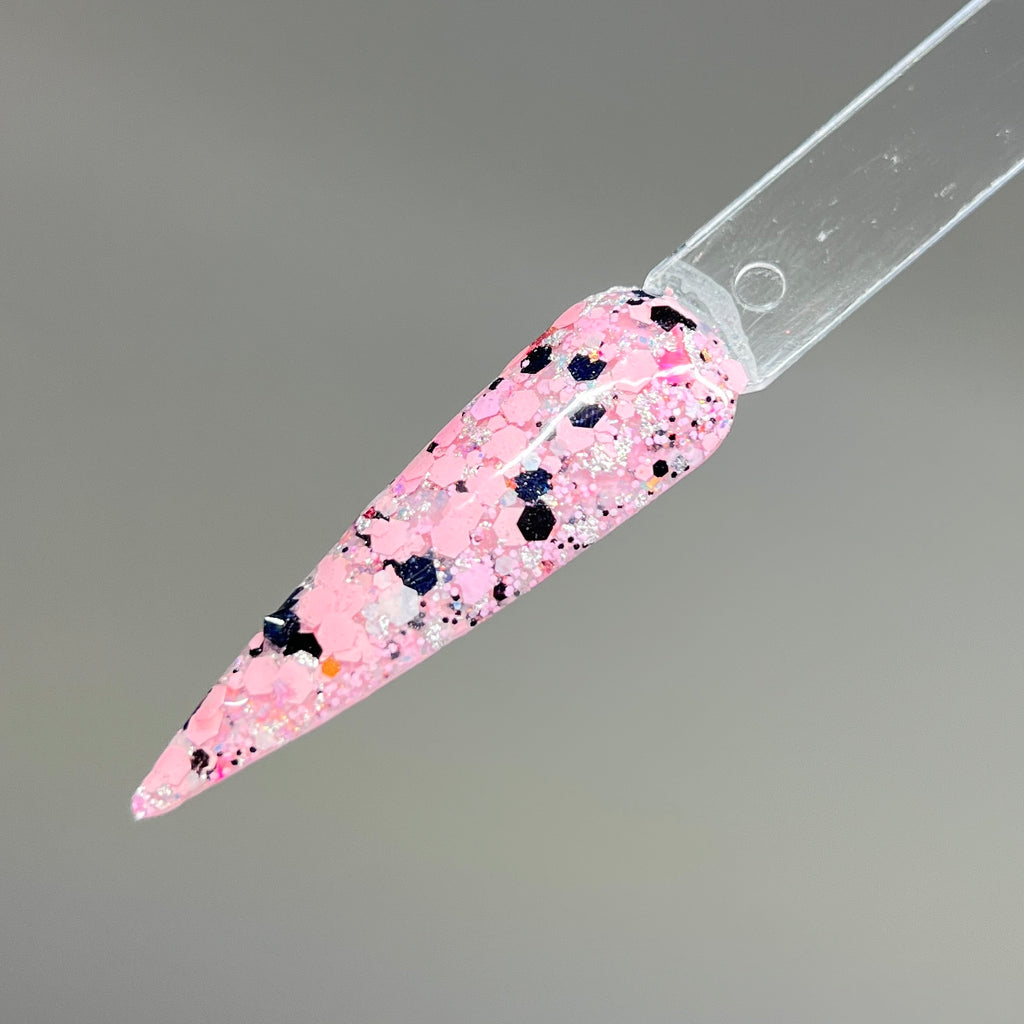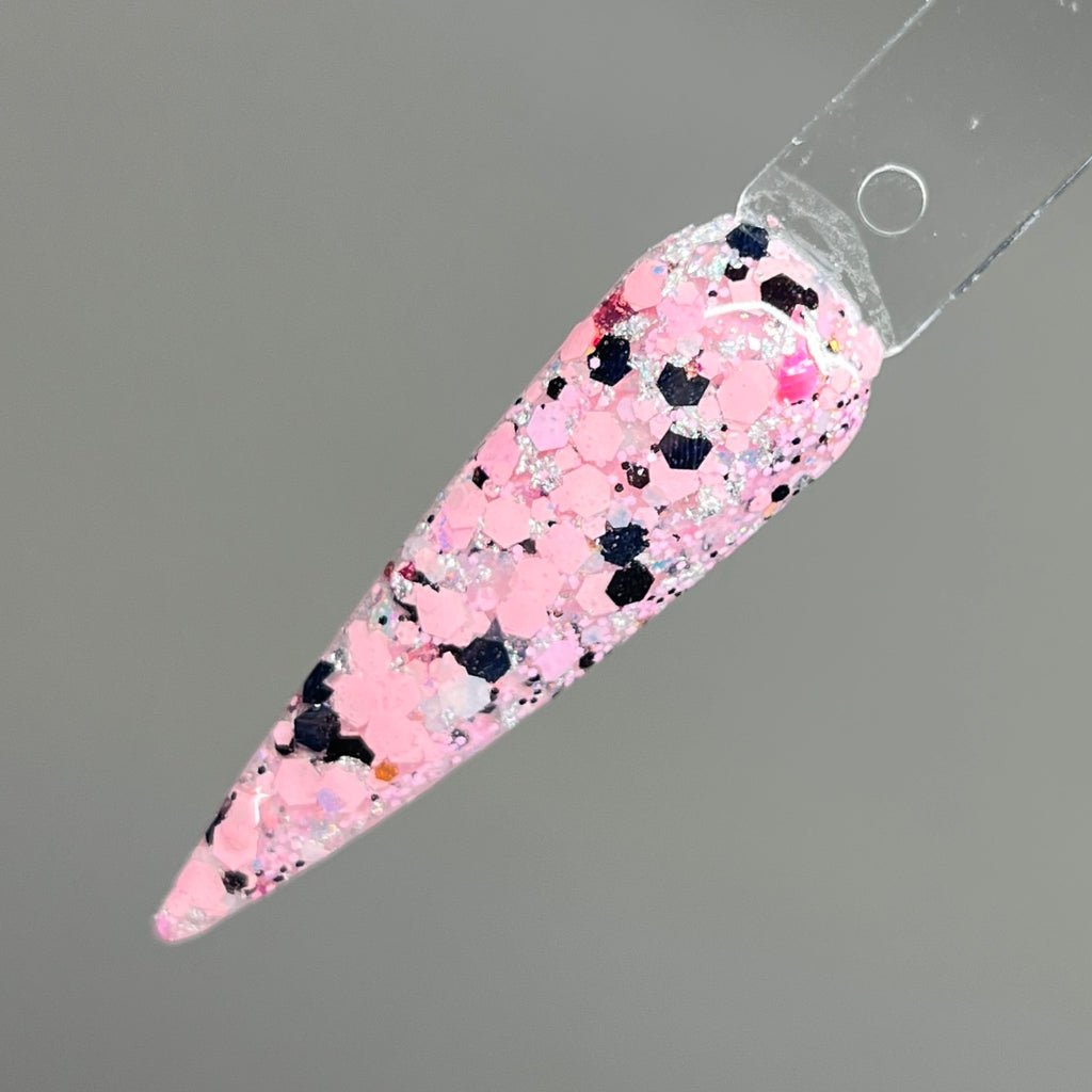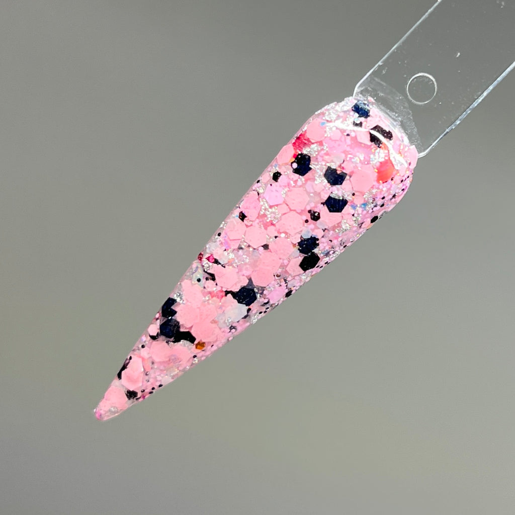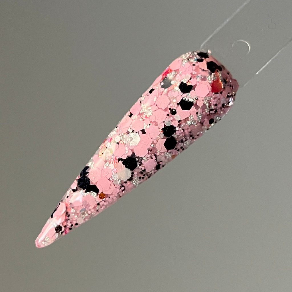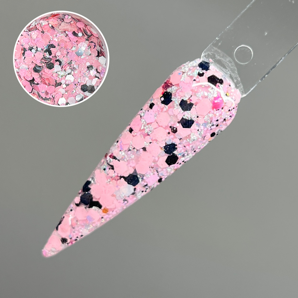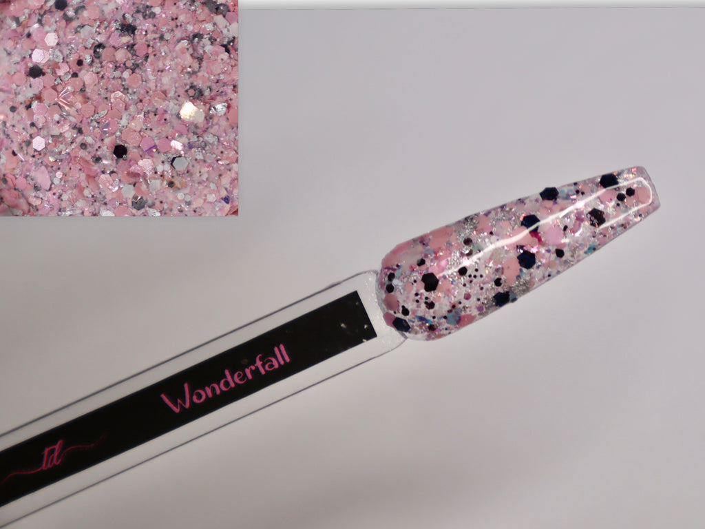 Wonderfall is a glitter mixture with pink and black chunky glitters with foils and flakes.